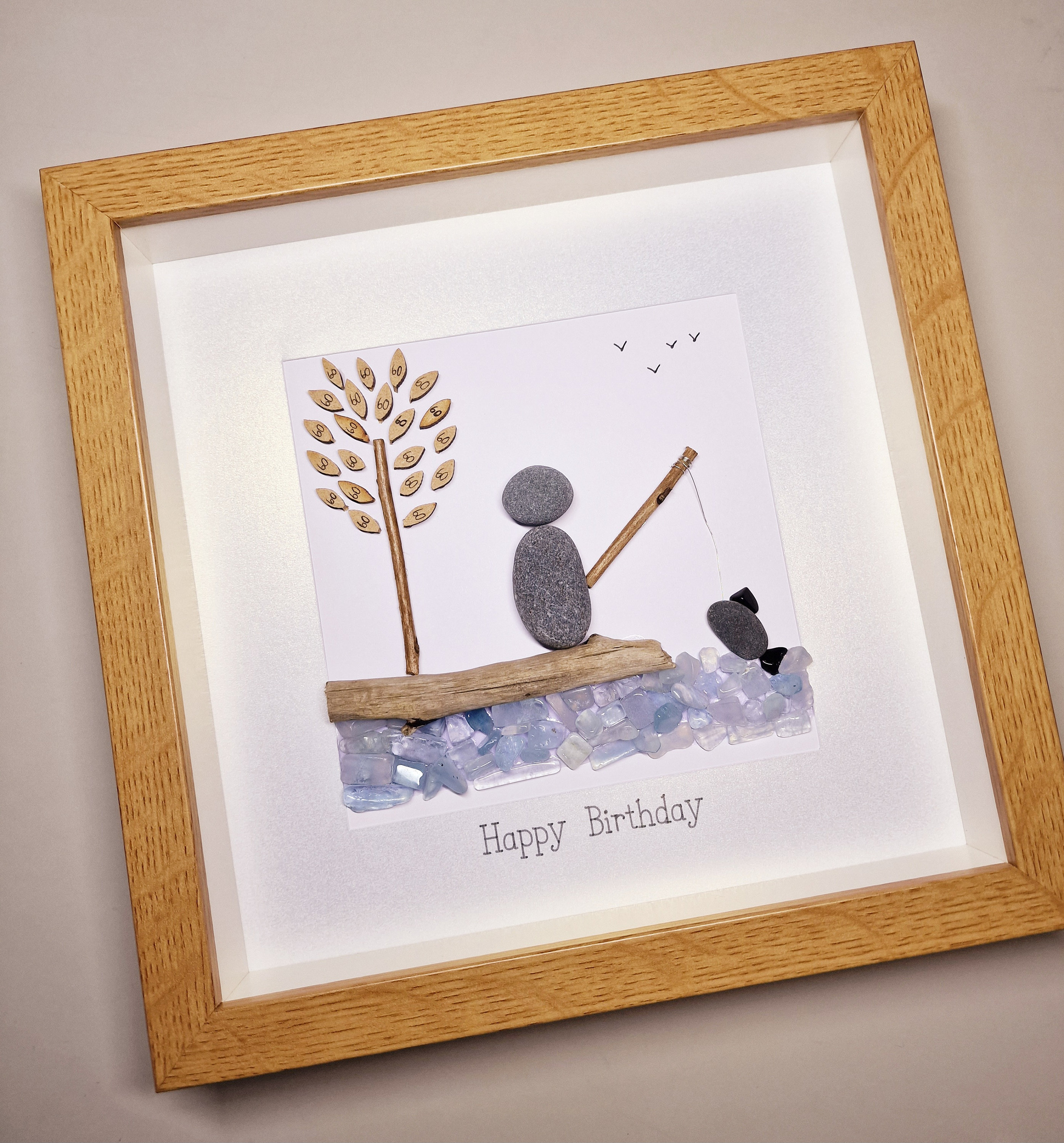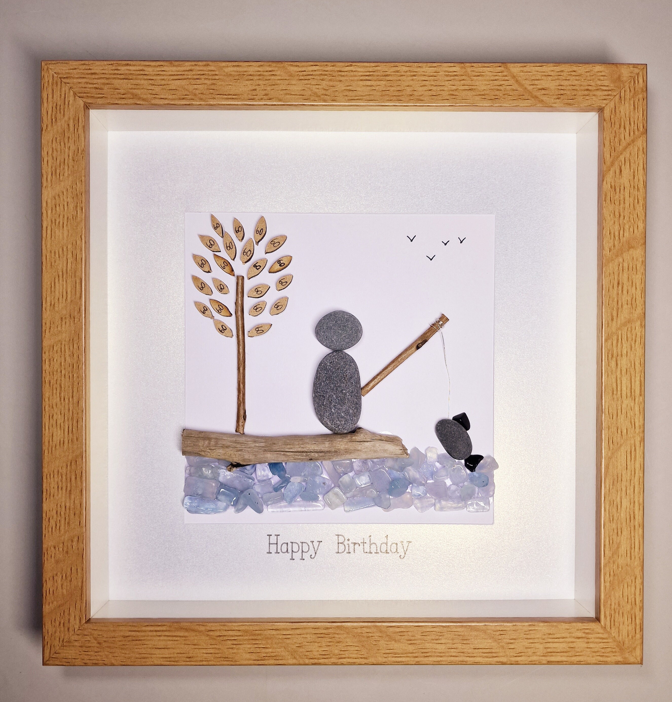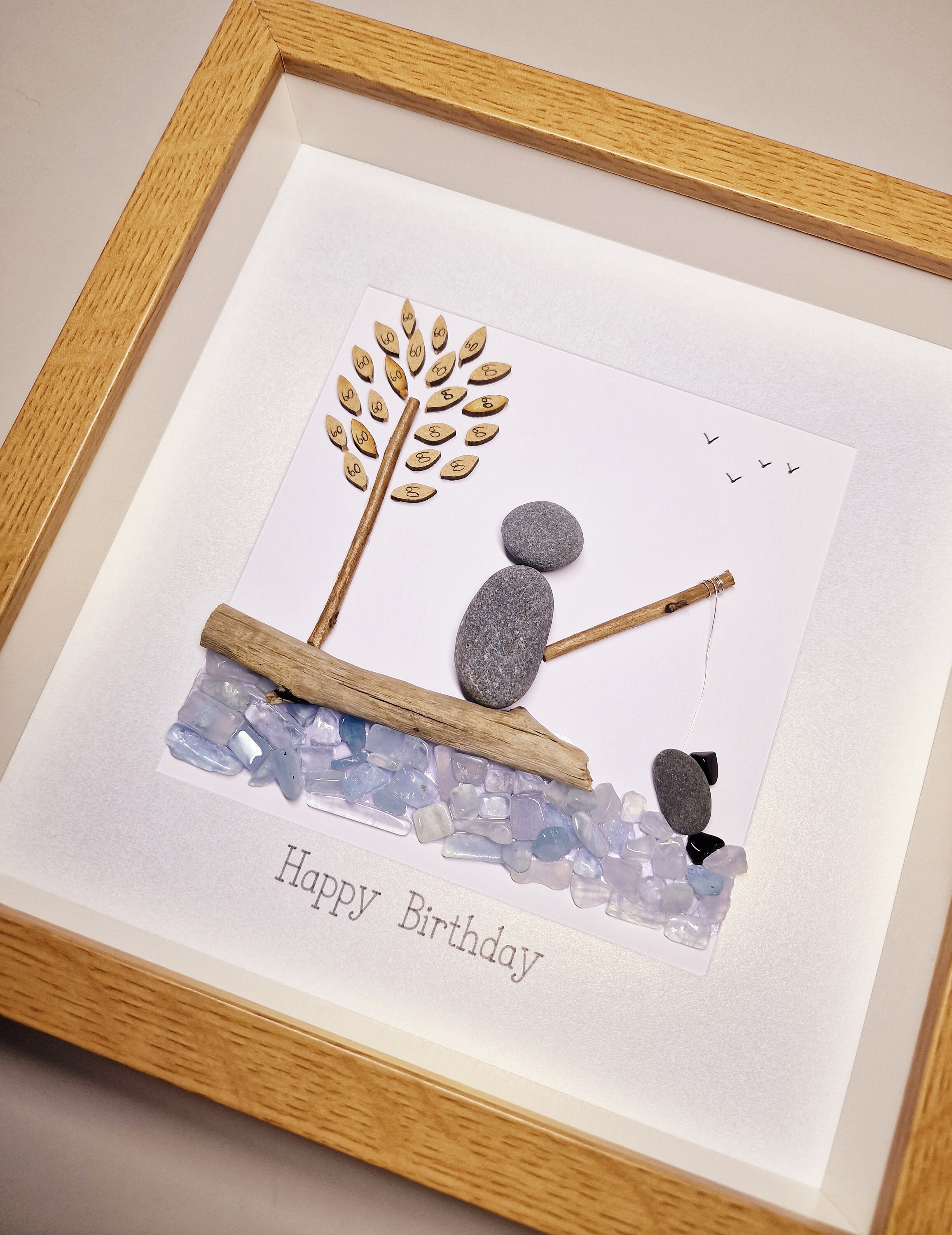 This charming framed pebble art picture features a person fishing, seated on a piece of driftwood with blue sea glass below to represent water. A tree beside them is adorned with “60” leaves to mark a 60th birthday – though any number can be added, or the tree can be left blank if you prefer. This thoughtful, hand-crafted picture makes a beautiful and unique gift, perfect for any keen fisher.