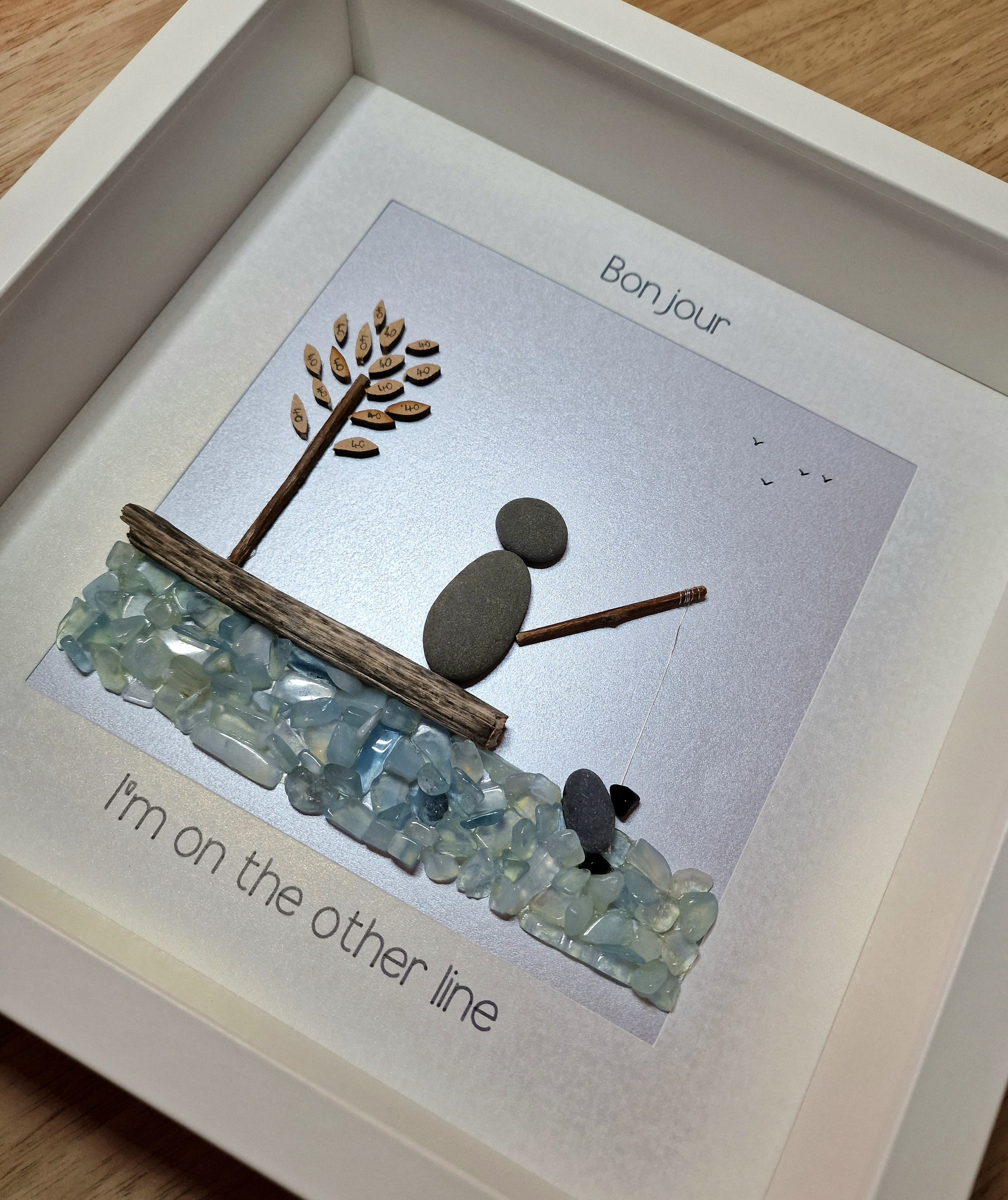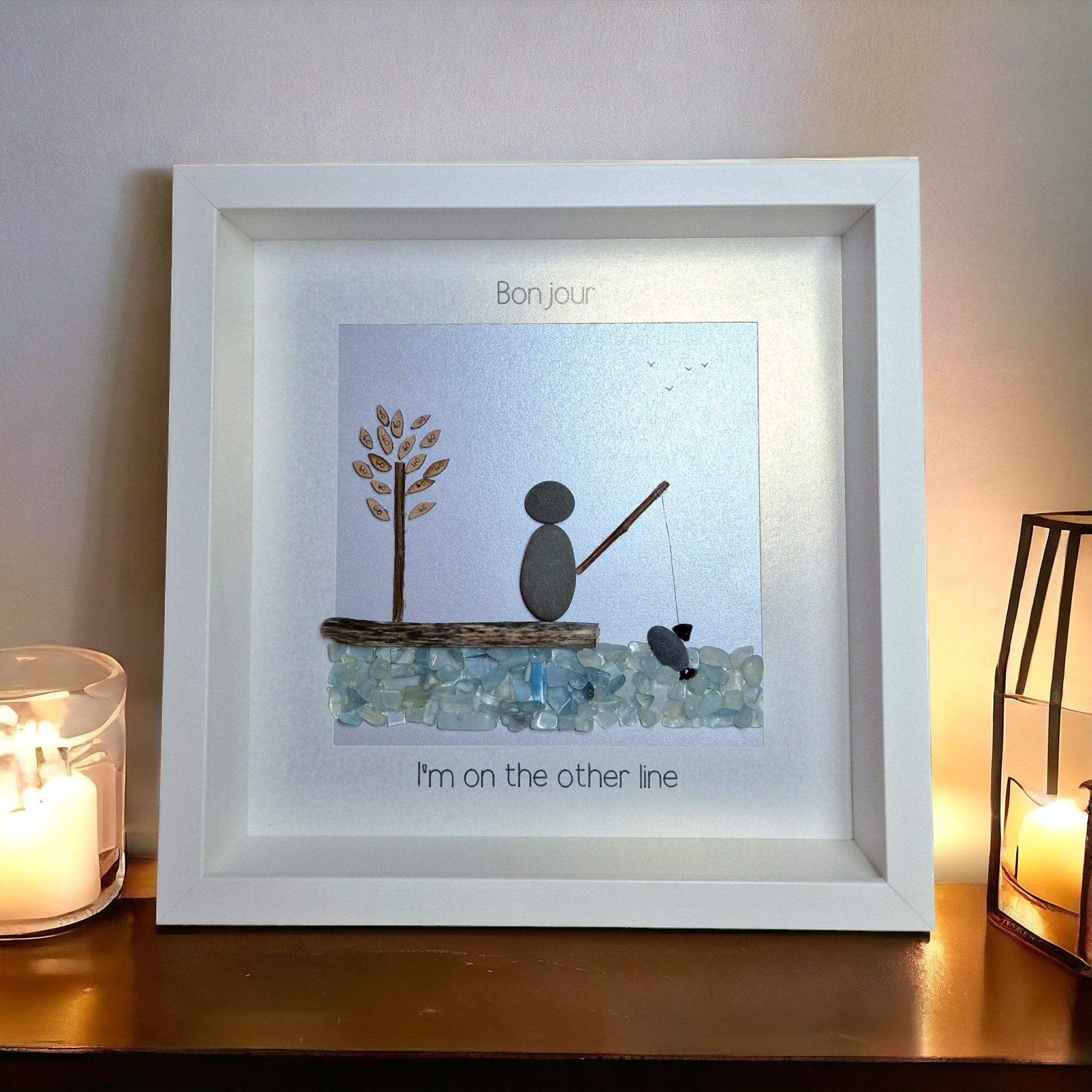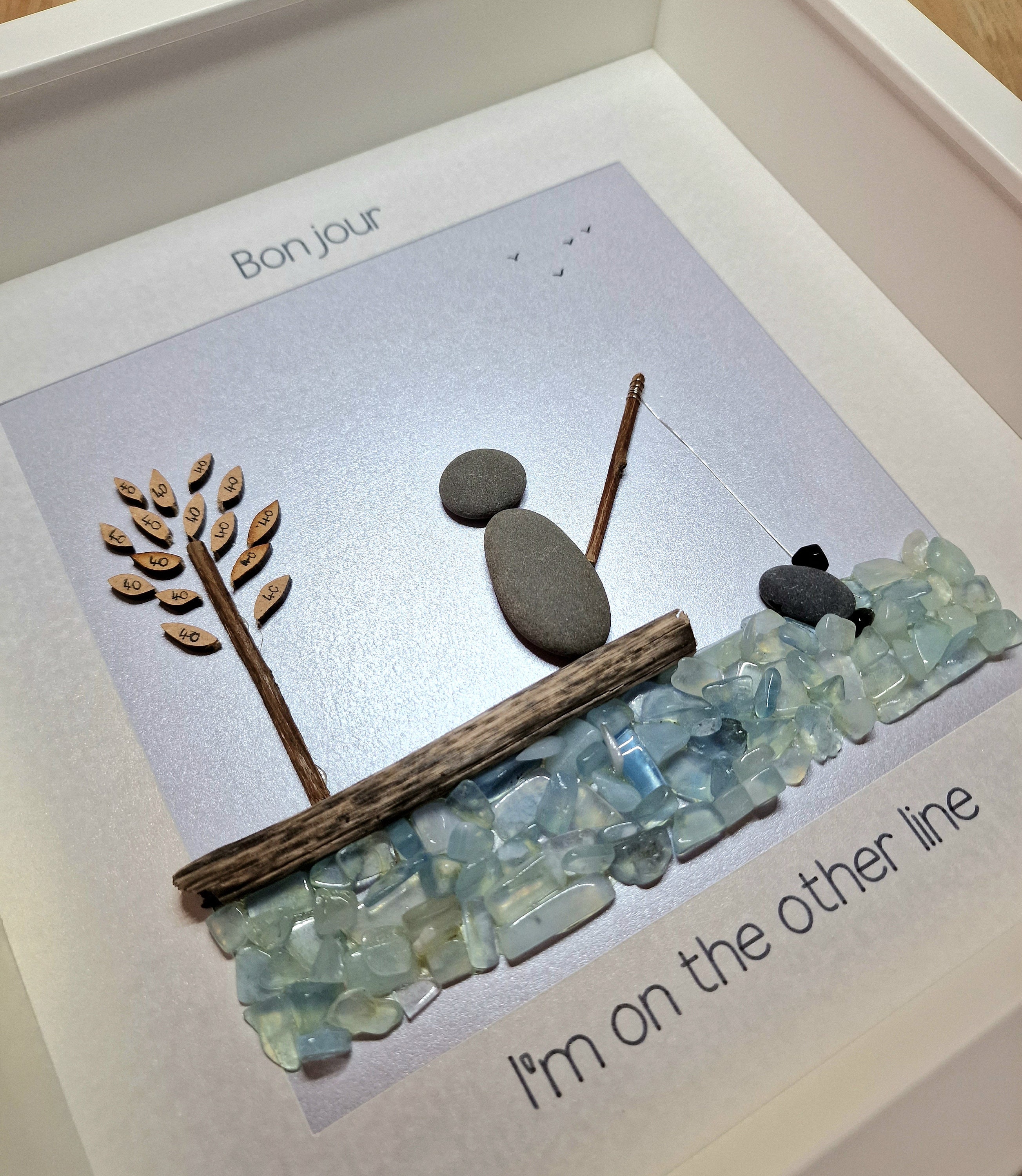 This charming framed pebble art picture features a person fishing, seated on a piece of driftwood with blue sea glass below to represent water. A tree beside them is adorned with “60” leaves to mark a 60th birthday – though any number can be added, or the tree can be left blank if you prefer. This thoughtful, hand-crafted picture makes a beautiful and unique gift, perfect for any keen fisher.