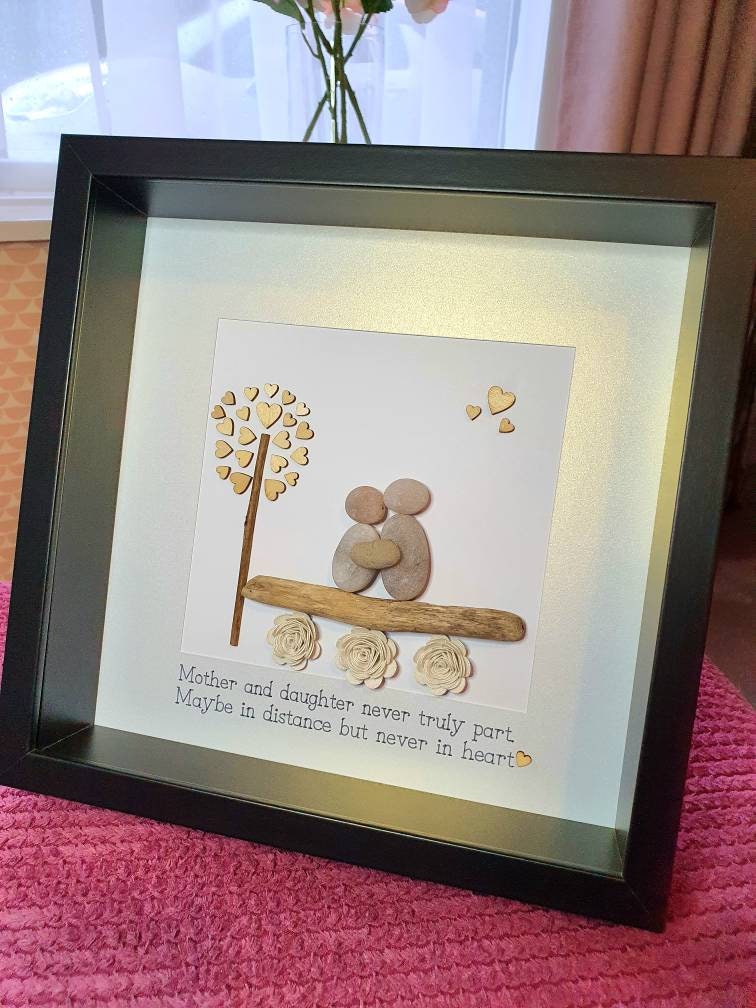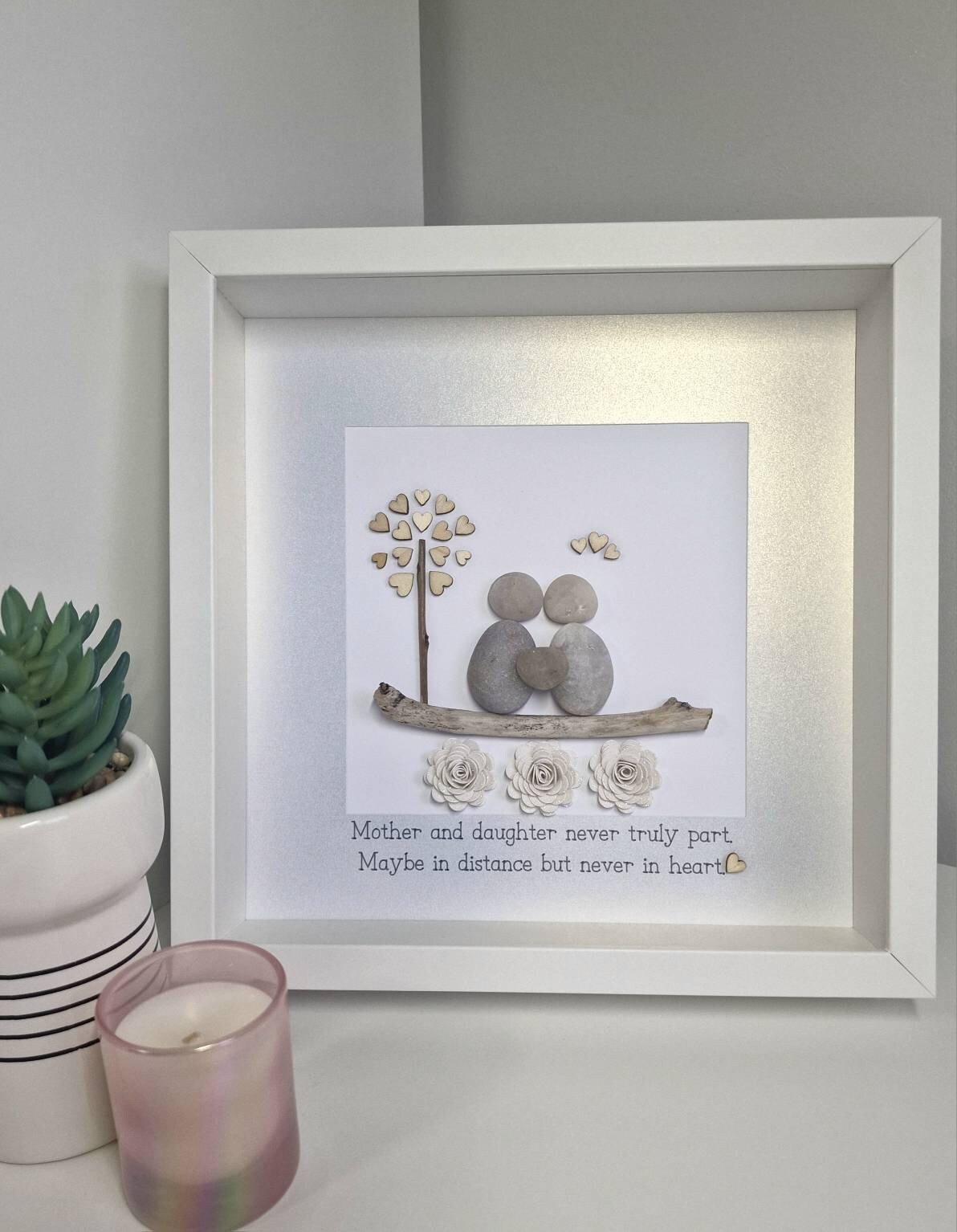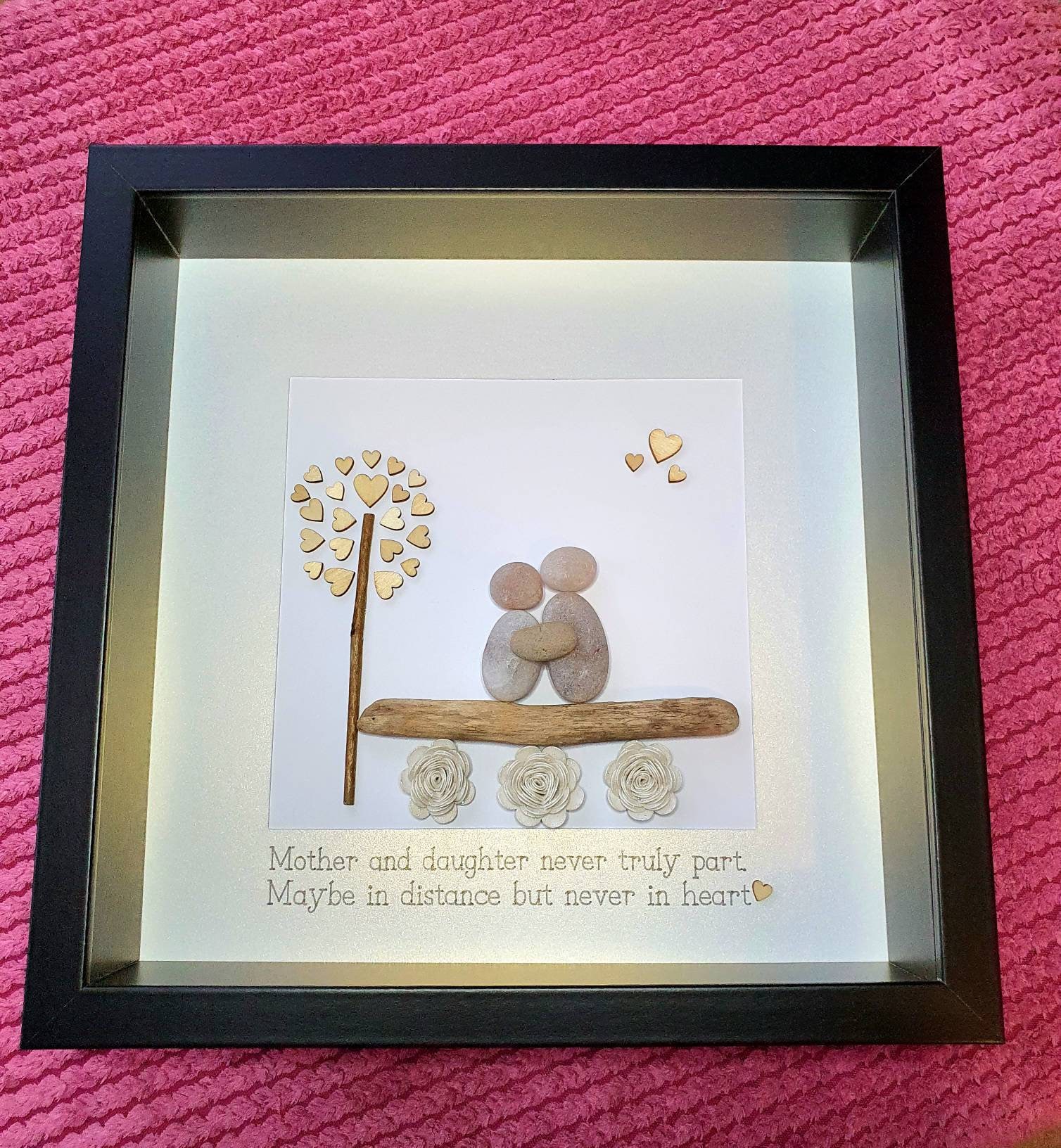This listing is for a pebble art framed picture with a Mum and her daughter/son. They are sitting on a piece of driftwood with very sparkly ivory flowers underneath, a tree with wooden love hearts sits beside them. The quote ‘Mother and daughter never truly part. Maybe in distance but never in heart’, is written underneath. The quote can be changed from daughter to son, or it can be removed or replaced with a quote of your choice.