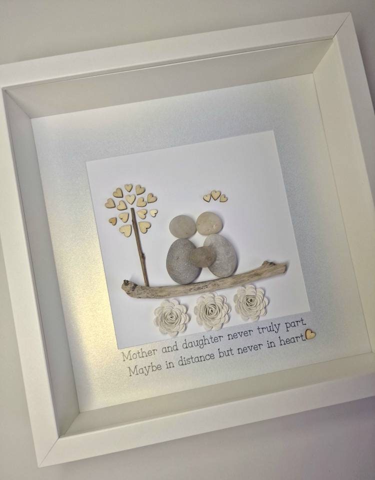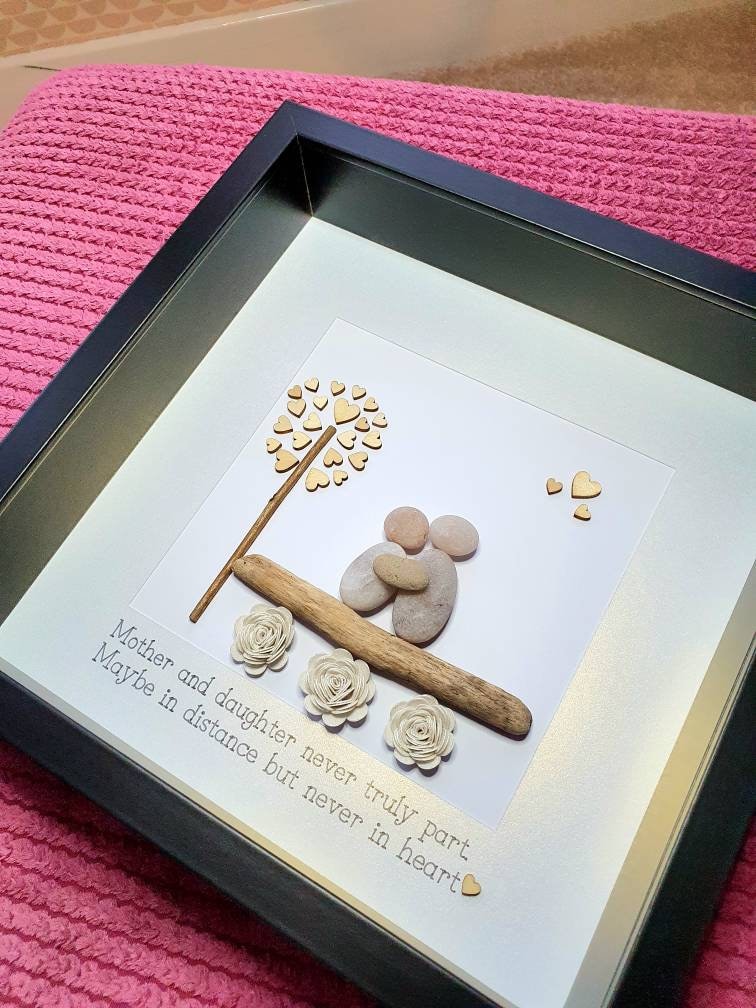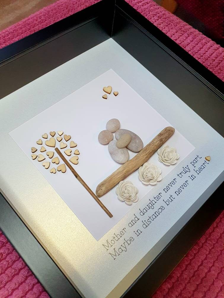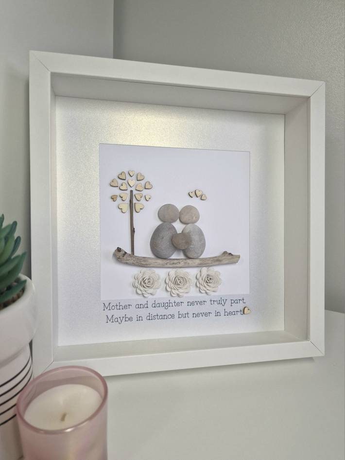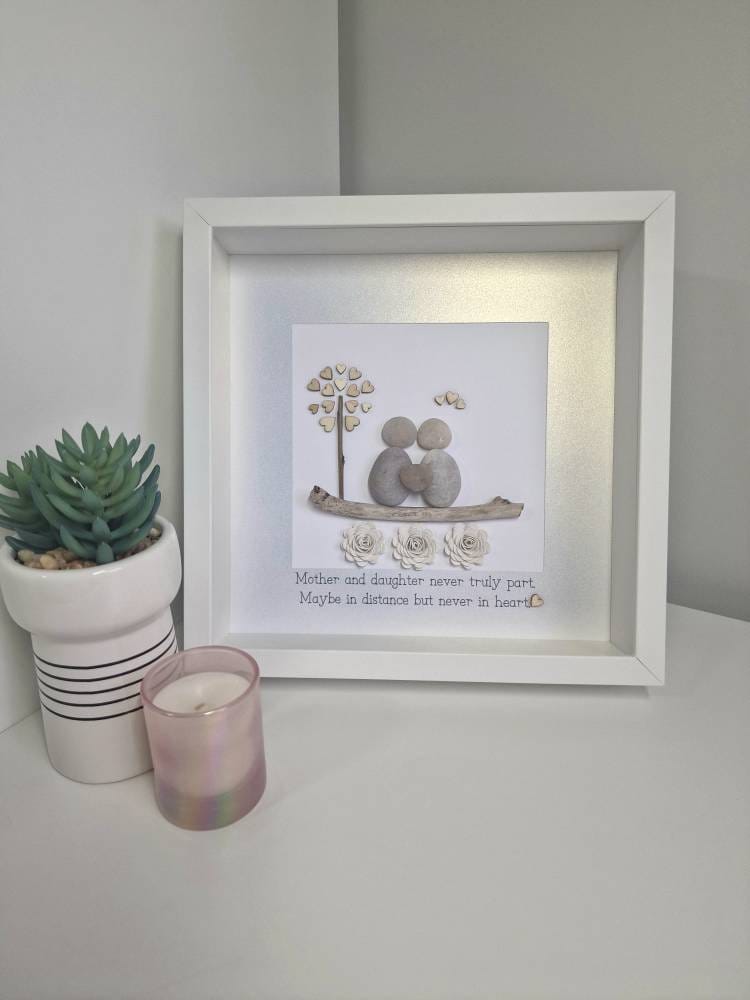 This listing is for a pebble art framed picture with a Mum and her daughter/son. They are sitting on a piece of driftwood with very sparkly ivory flowers underneath, a tree with wooden love hearts sits beside them. The quote ‘Mother and daughter never truly part. Maybe in distance but never in heart’, is written underneath. The quote can be changed from daughter to son, or it can be removed or replaced with a quote of your choice.