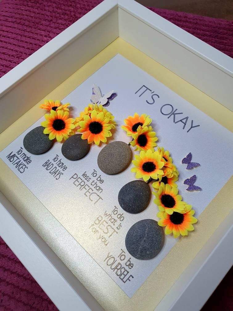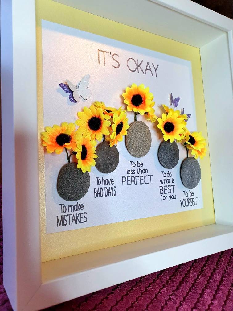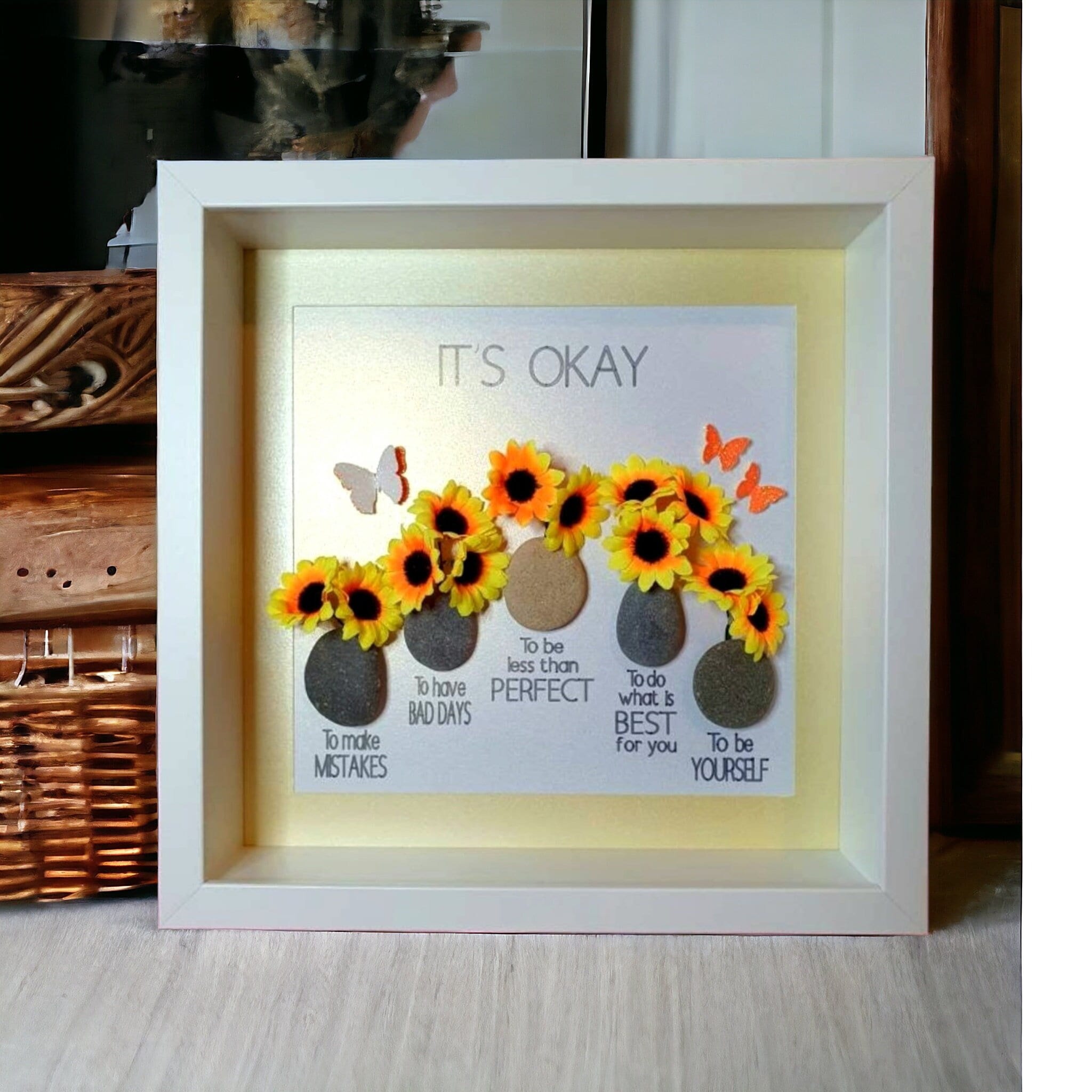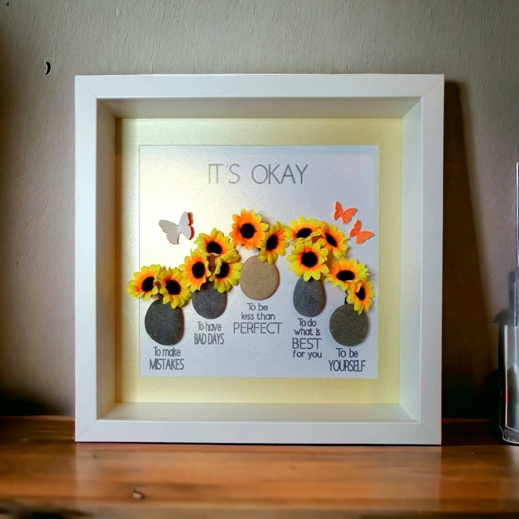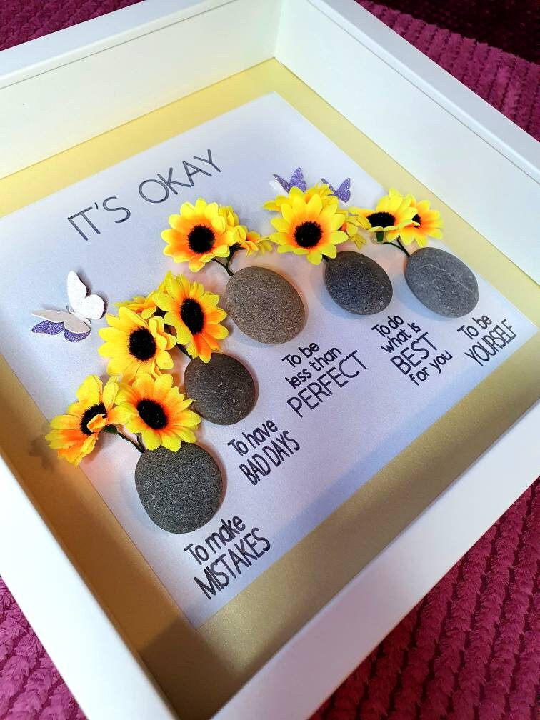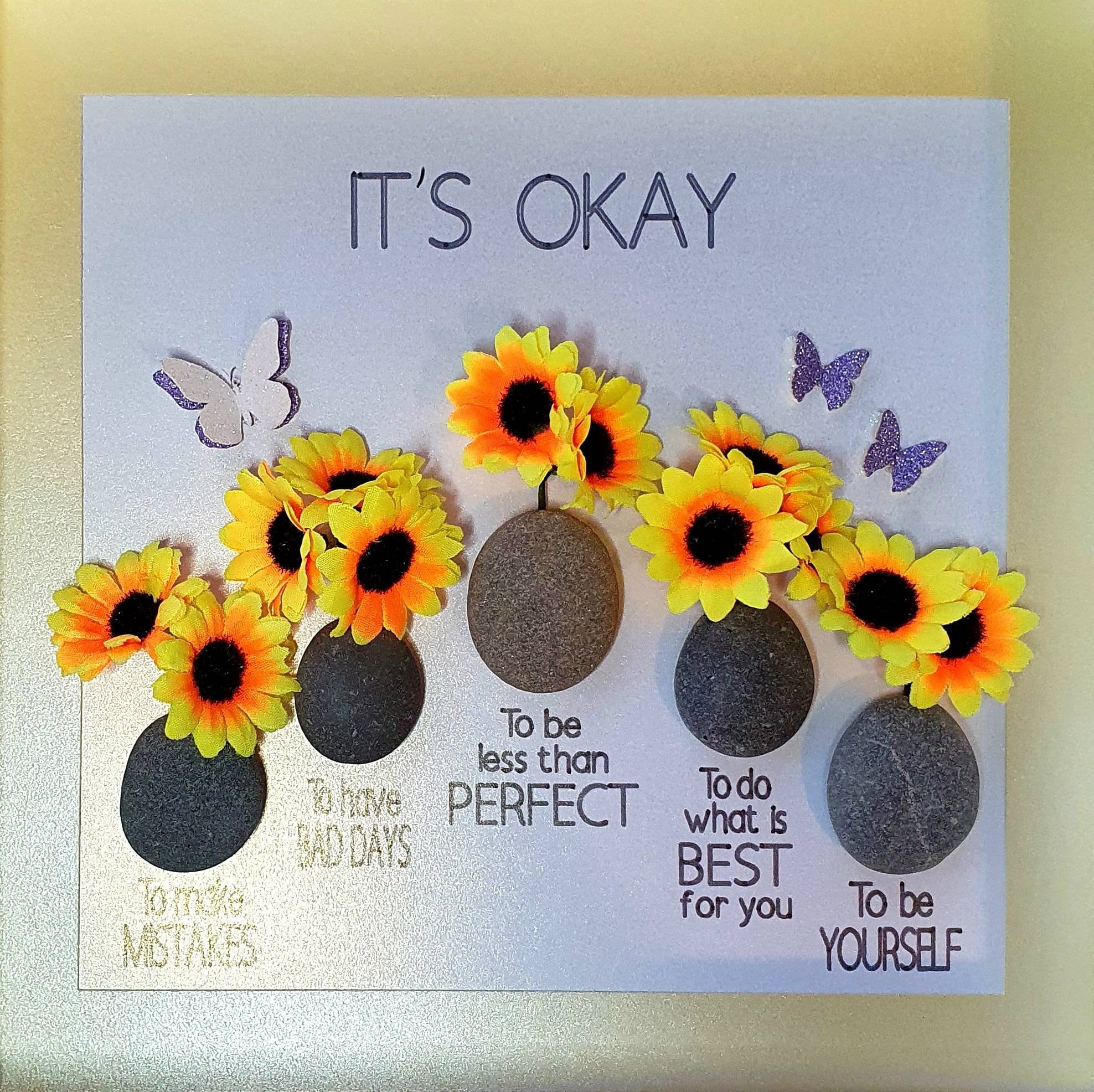 This listing features five pebble vases, each holding a sunflower 🌻, with an uplifting "It's okay" quote beneath each vase. Three butterflies accompany the sunflowers, and both the quotes and butterfly colours can be personalised to your liking. Please provide your customisation details at checkout.