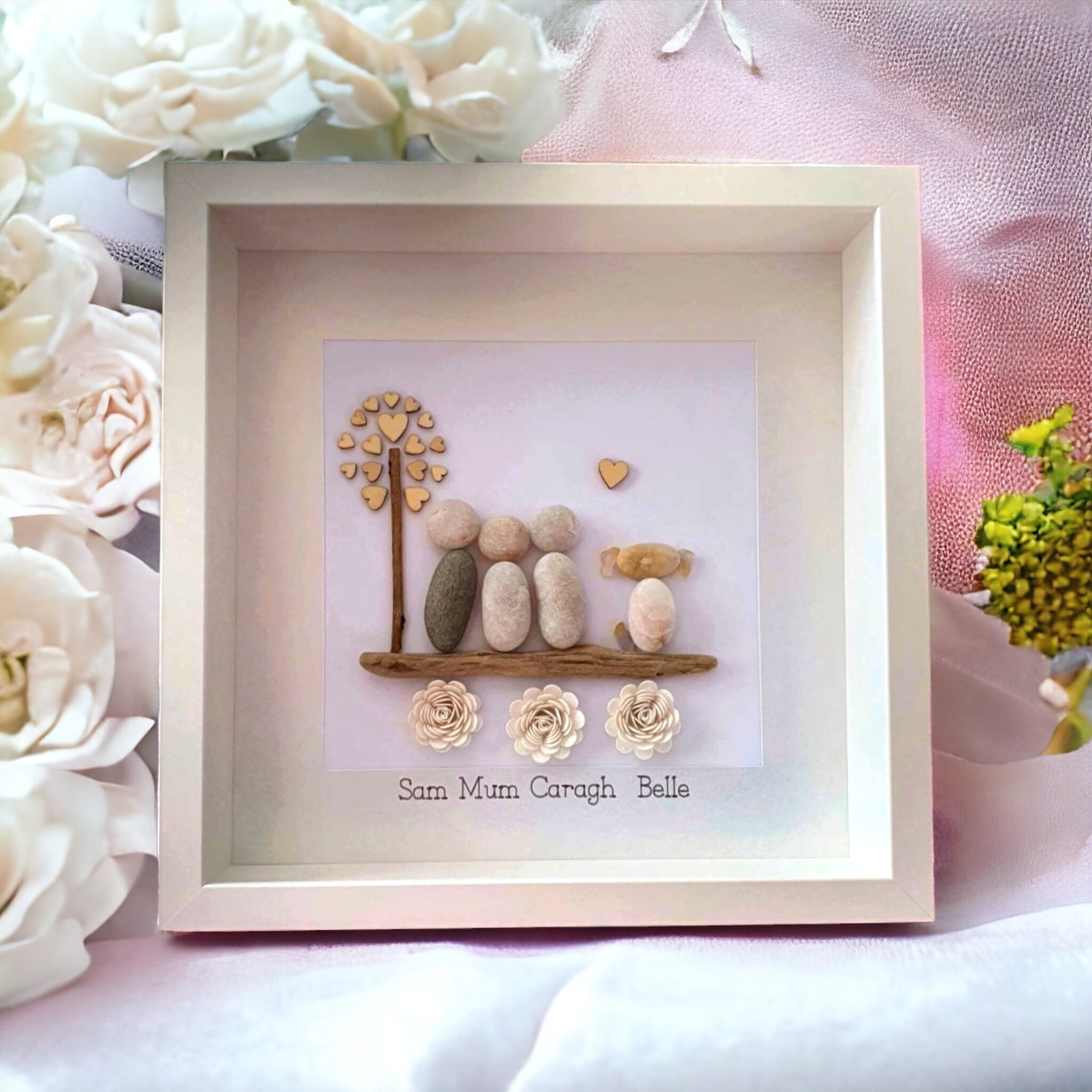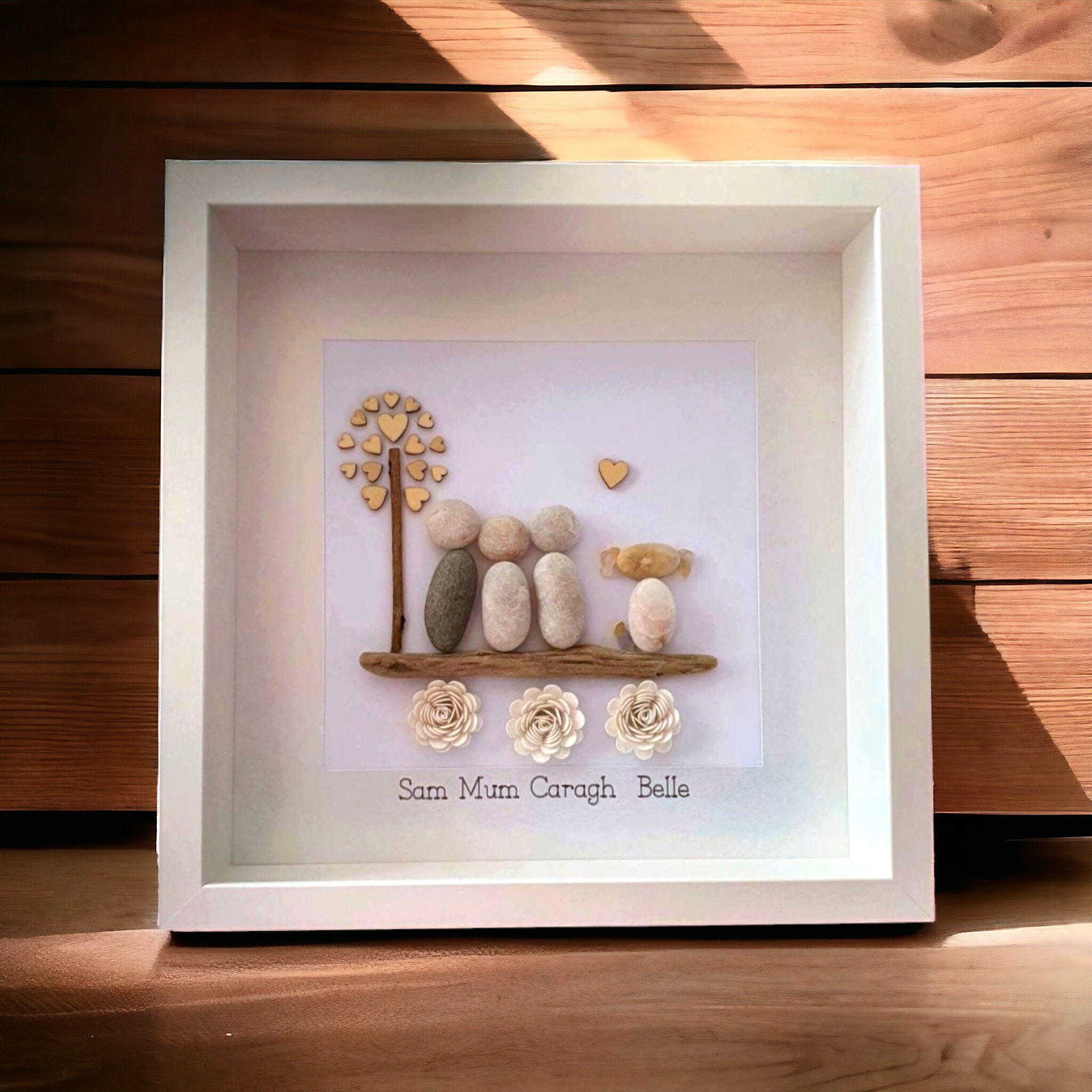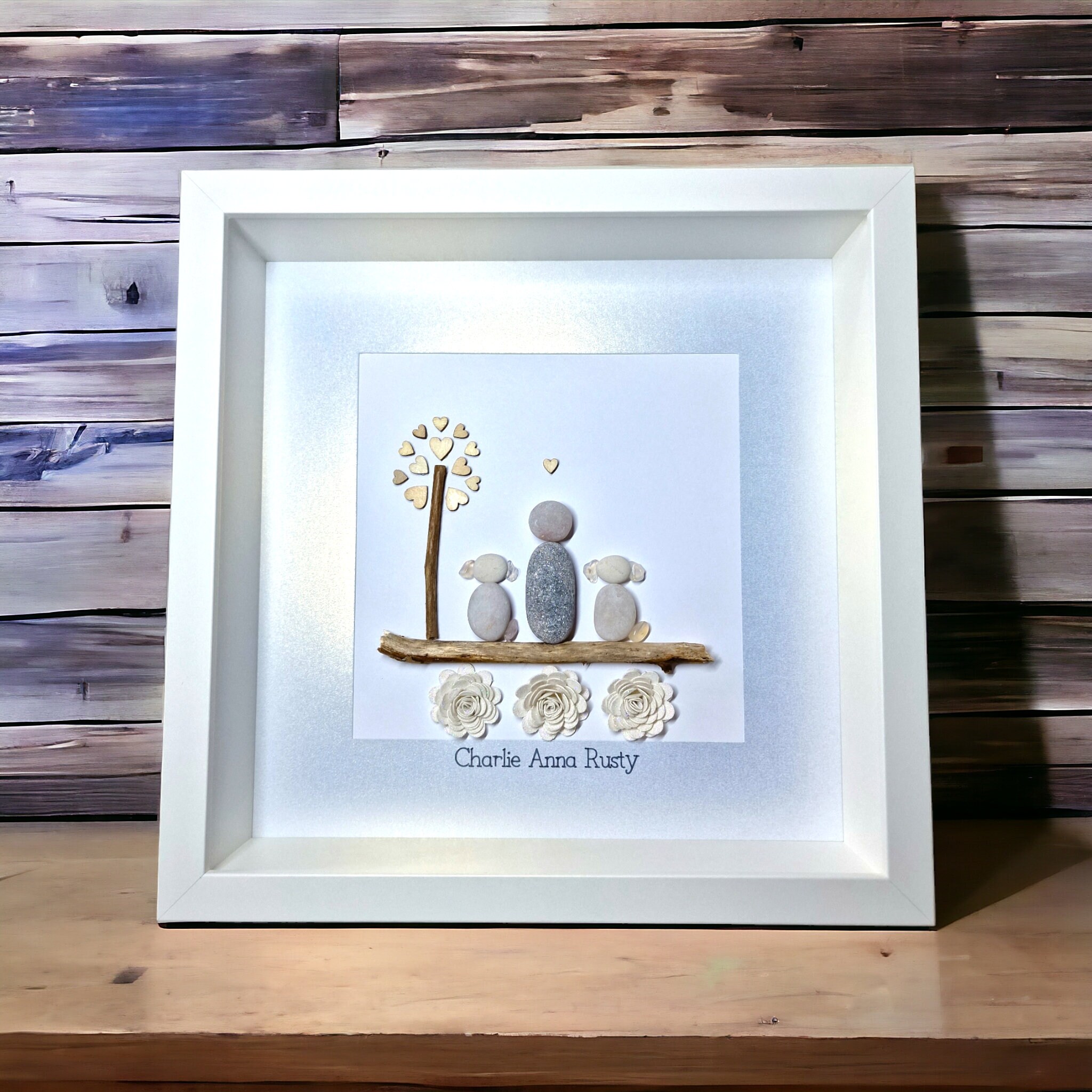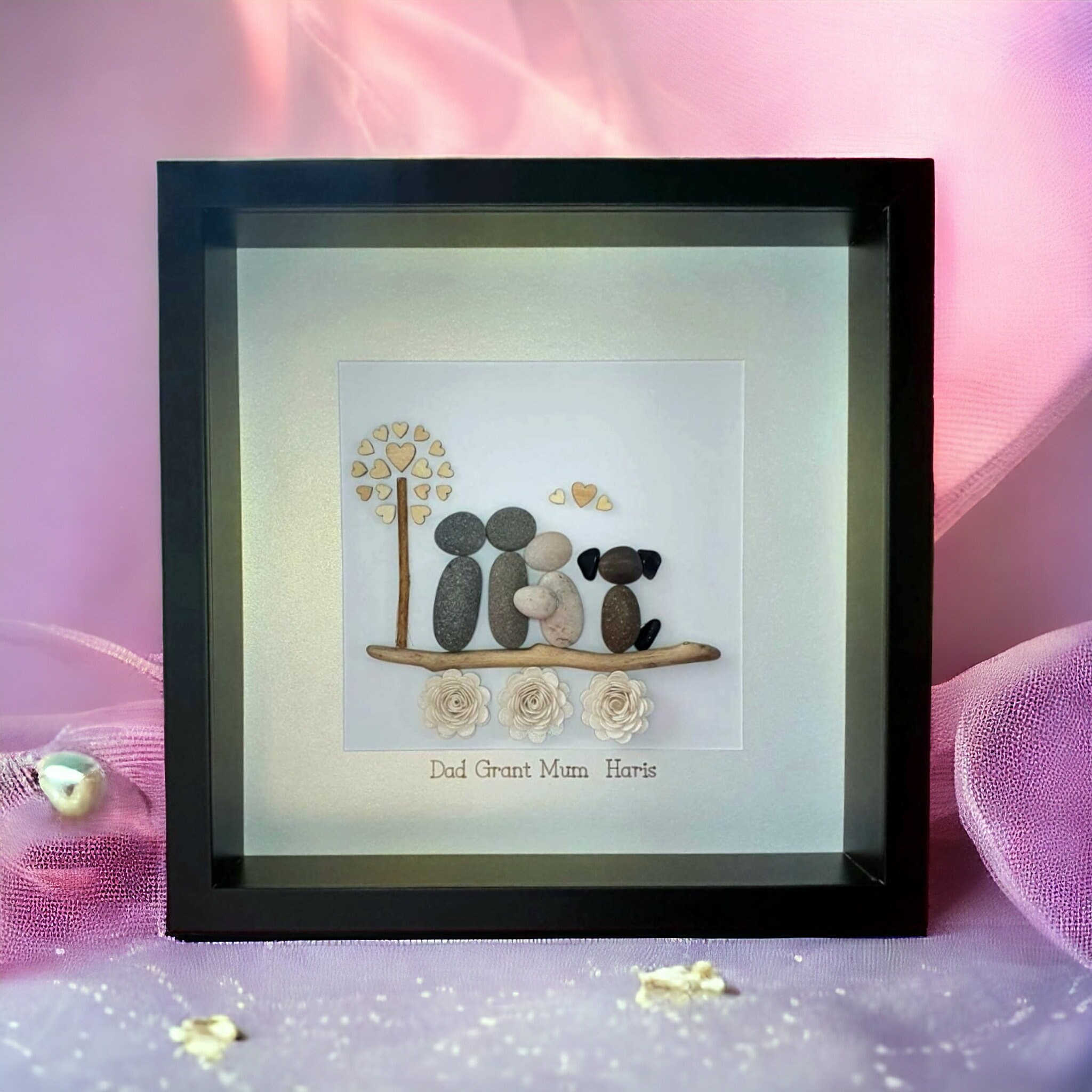 This listing is for a framed pebble art picture featuring a family of three cuddling beside a tree with a wooden heart detail. The family and their dog sit on a piece of driftwood, with sparkly flowers underneath for a charming touch.