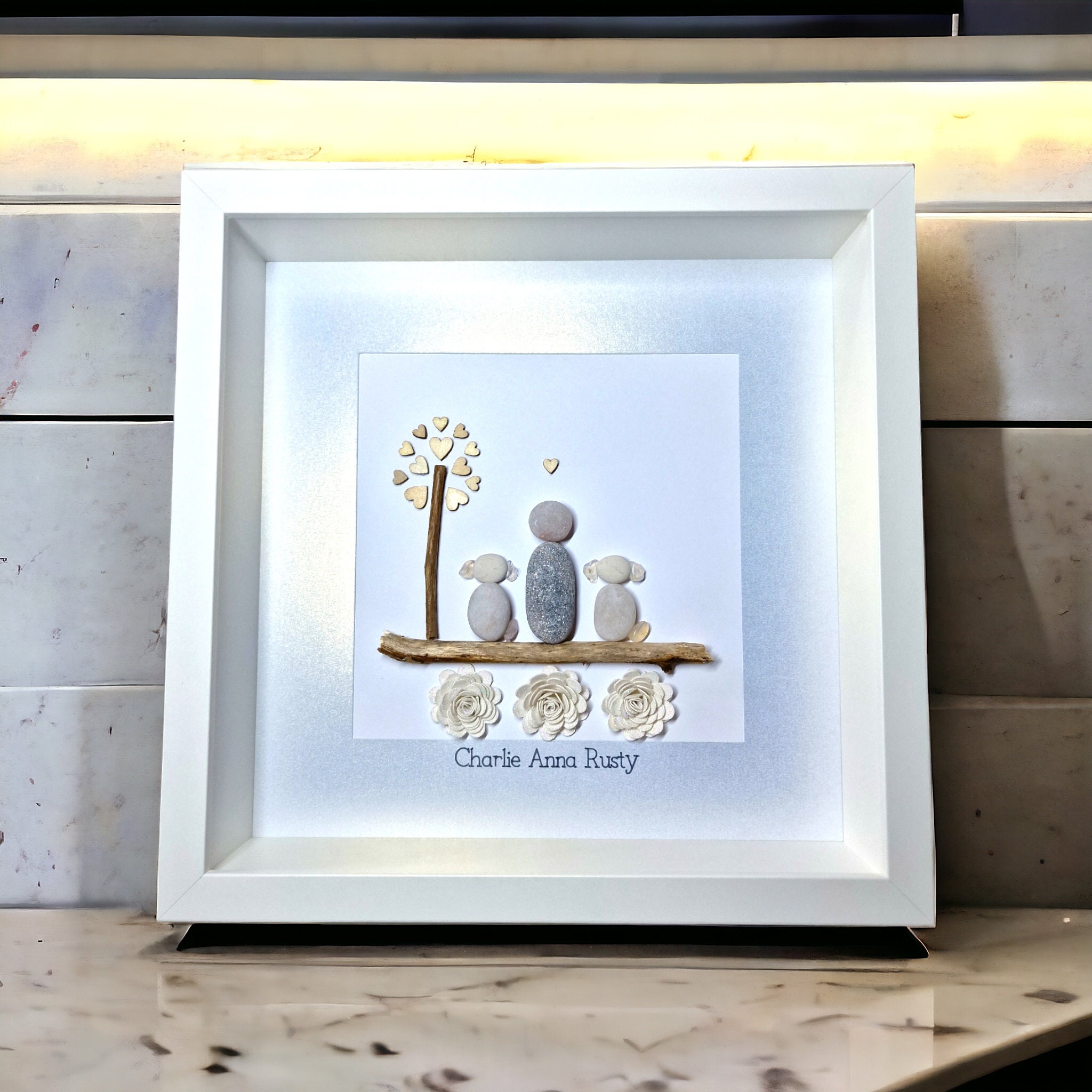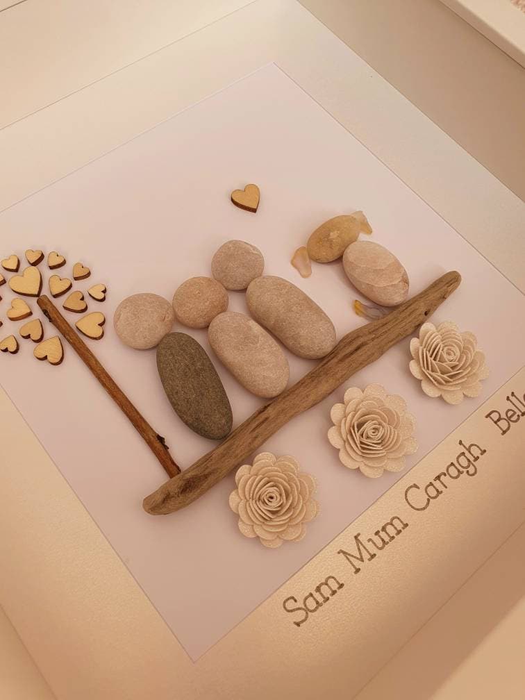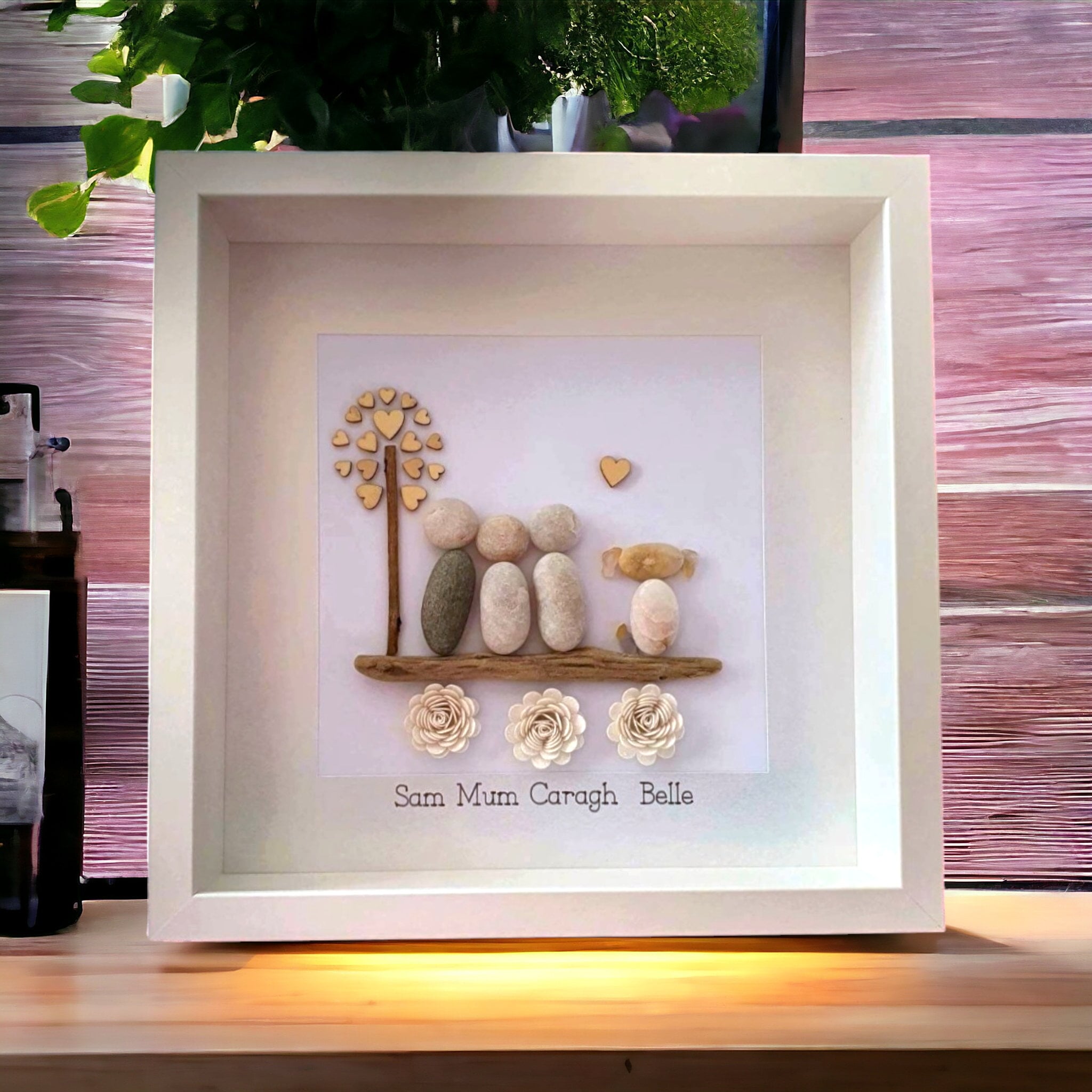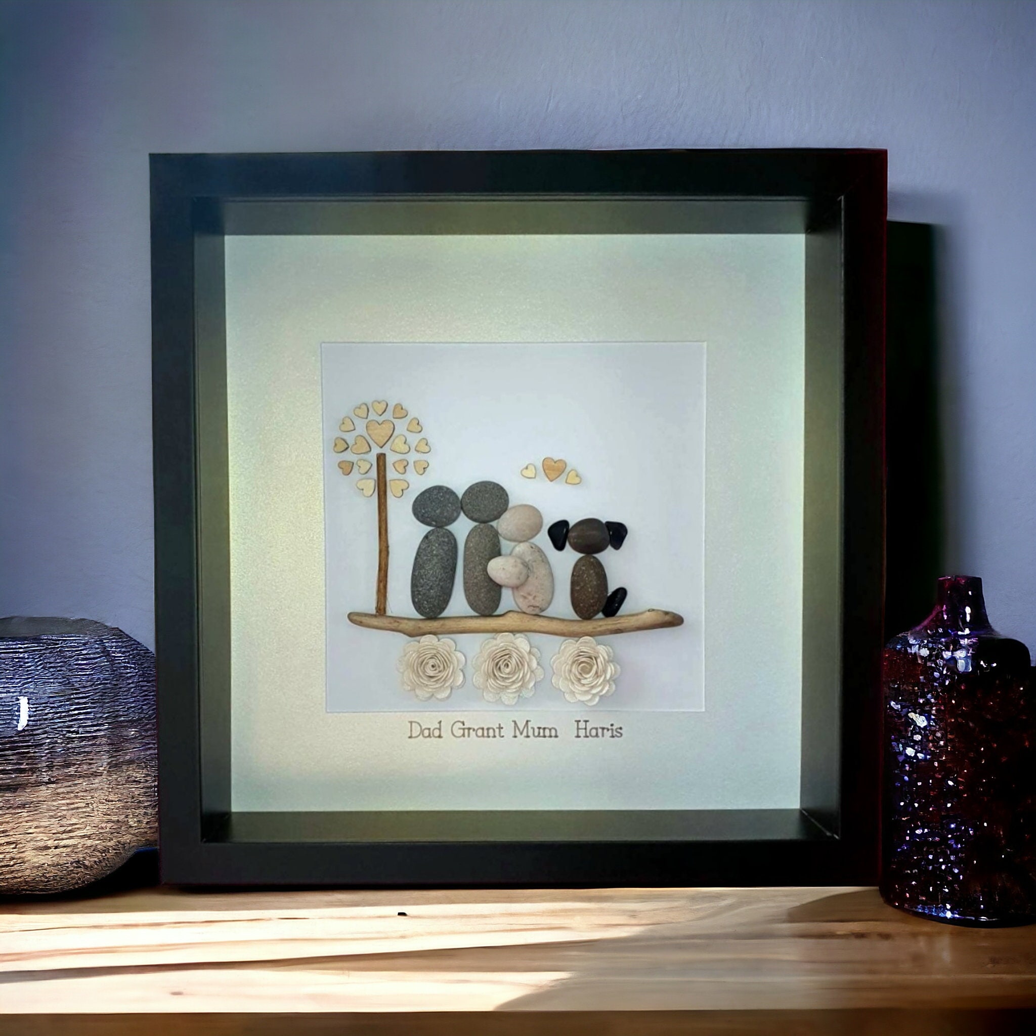 This listing is for a framed pebble art picture featuring a family of three cuddling beside a tree with a wooden heart detail. The family and their dog sit on a piece of driftwood, with sparkly flowers underneath for a charming touch.