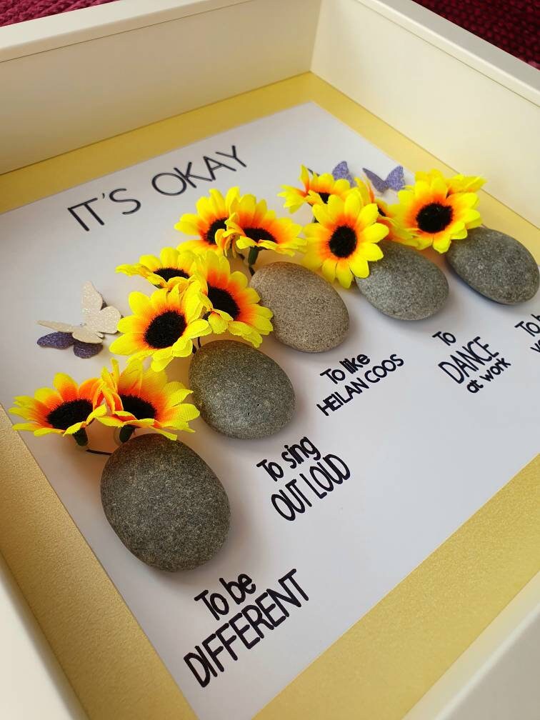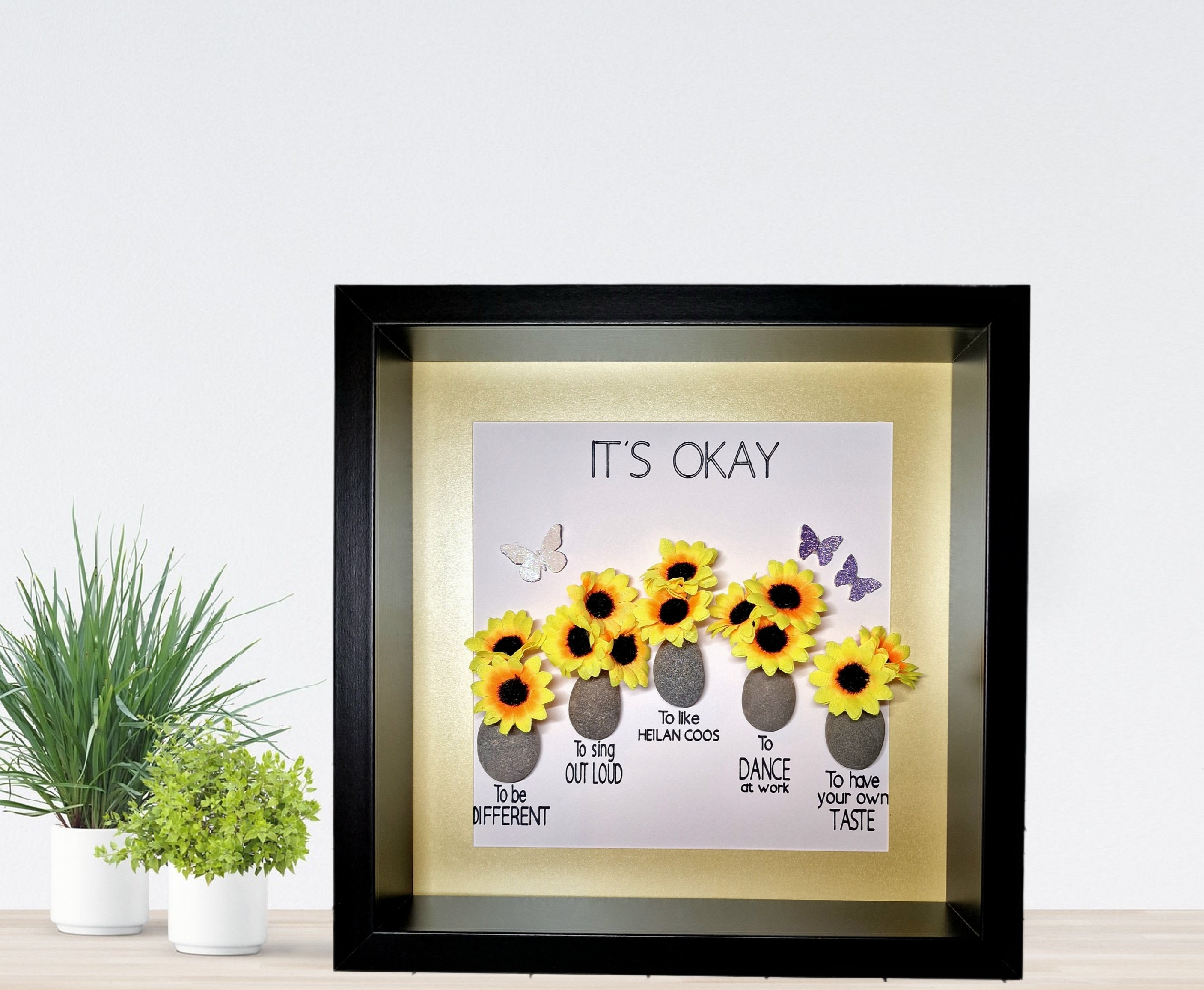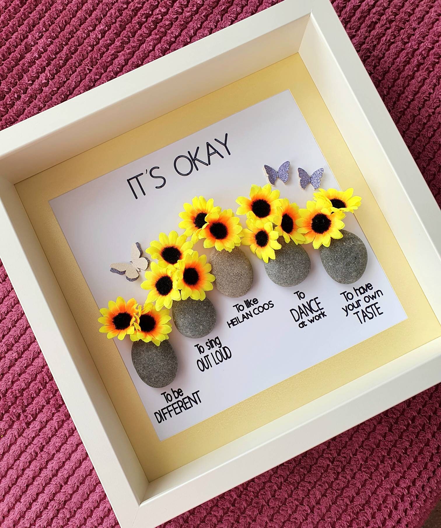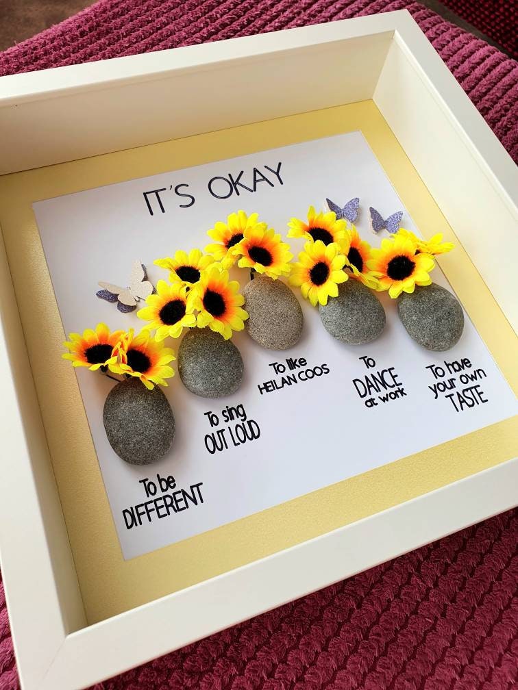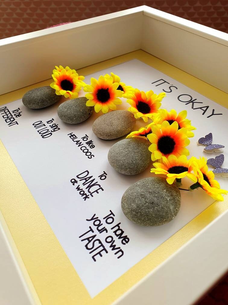 This listing features a pebble art framed picture with five pebble vases, each containing sunflowers 🌻. Beneath each vase is an 'It's okay' quote. Three butterflies accompany the sunflowers.