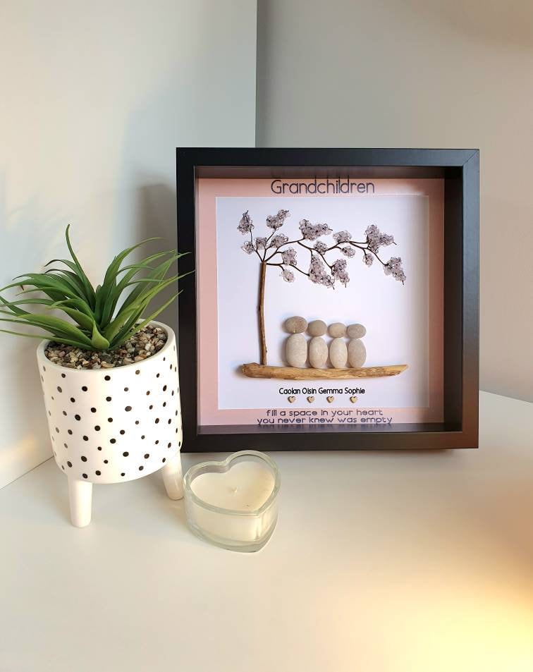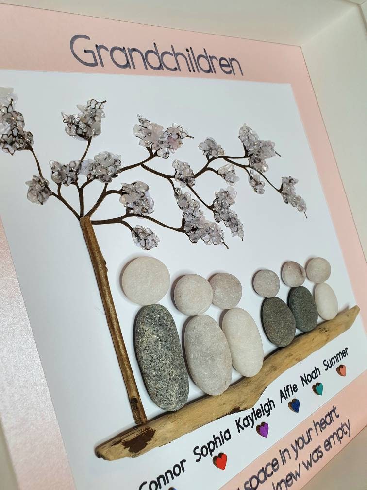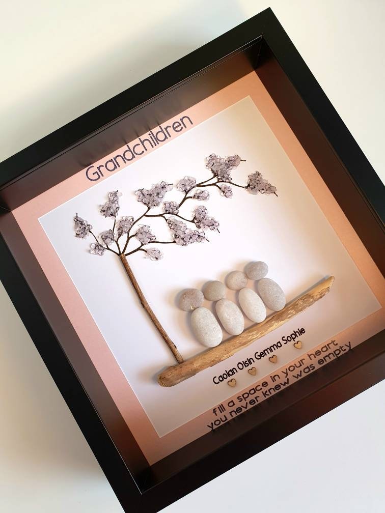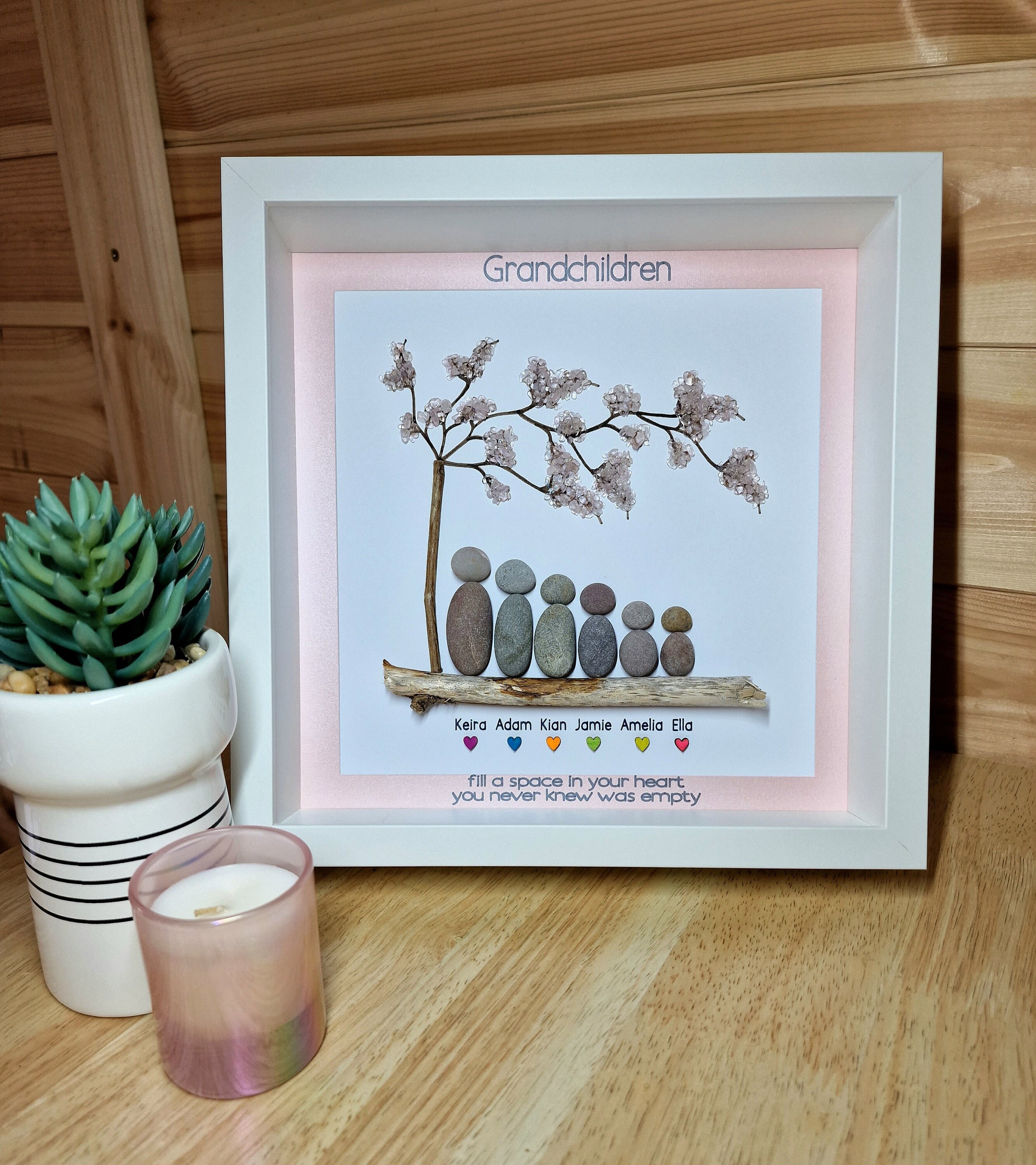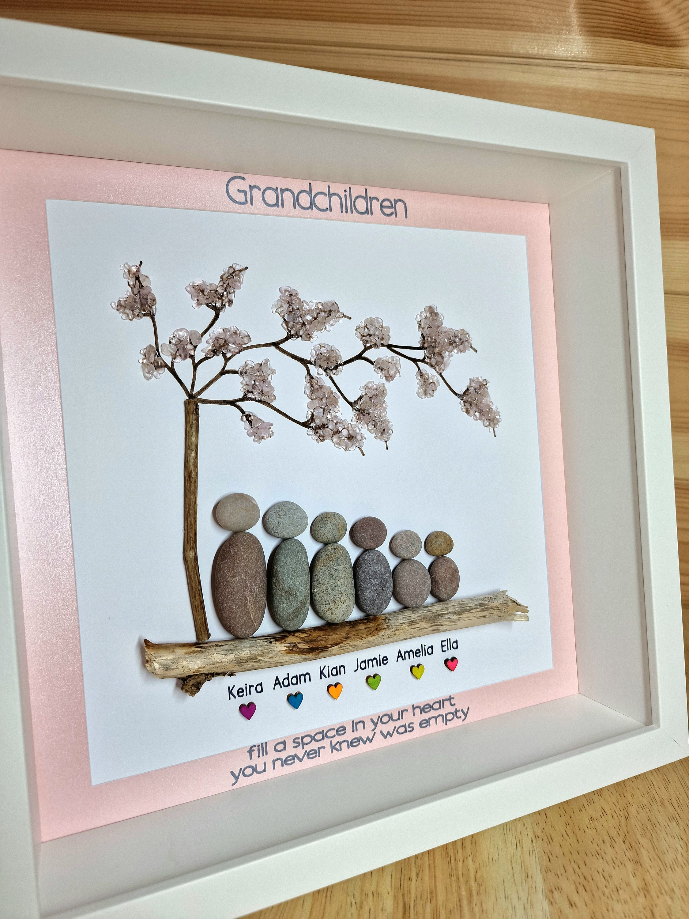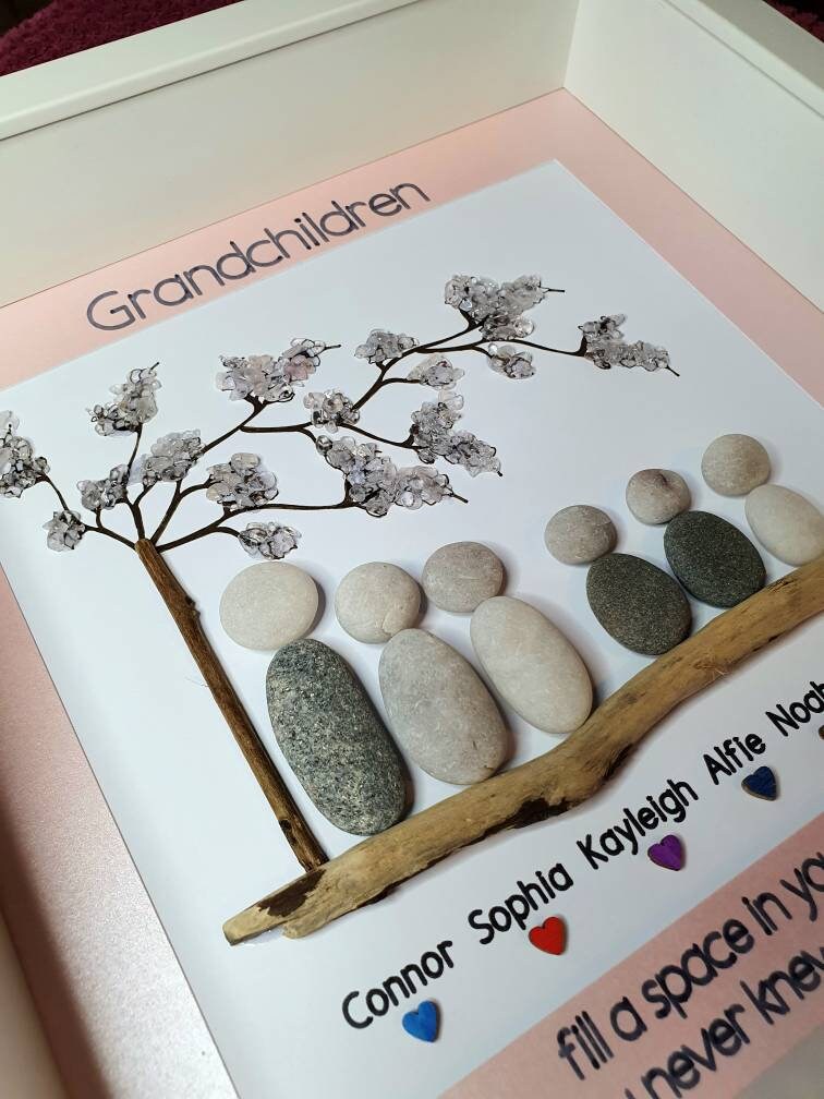 This listing is for a pebble art framed picture with 6 grandchildren. The children are sitting on a piece of driftwood with a hanging tree beside them. Their names are written underneath with a coloured heart.