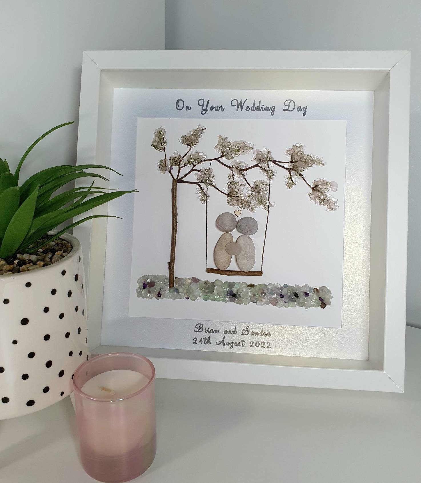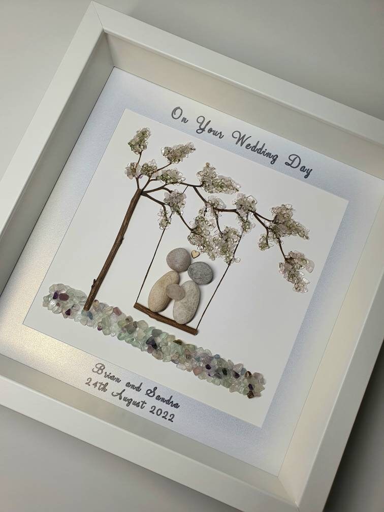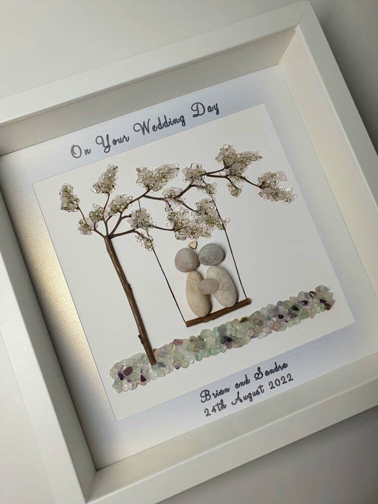 This listing is for a pebble art framed picture with a couple sitting on a tree swing 💜