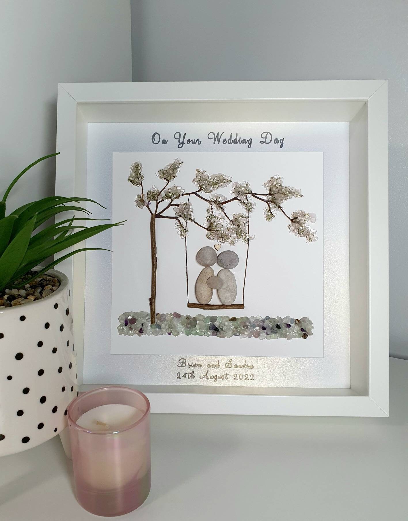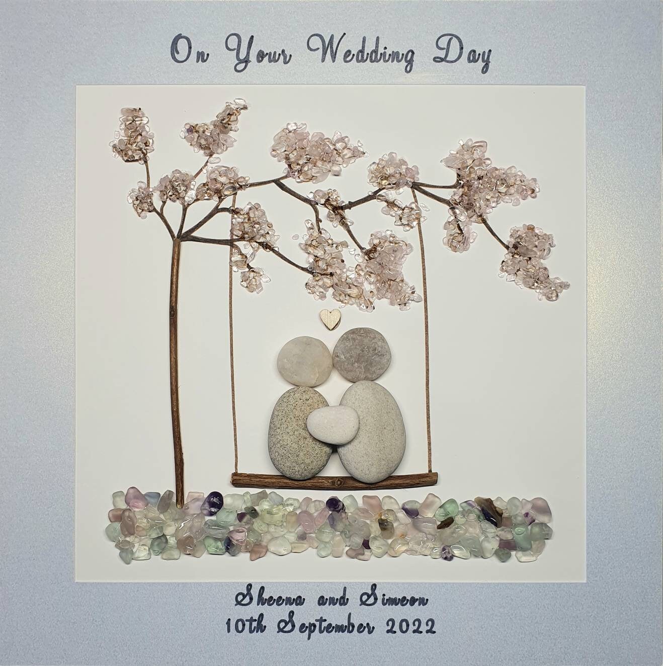 The tree swing is hanging from a cherry blossom tree. Underneath the tree swing are coloured quartz crystals. The quote 'On Your Wedding Day' is written above them. The couple's wedding date and their names are written below.