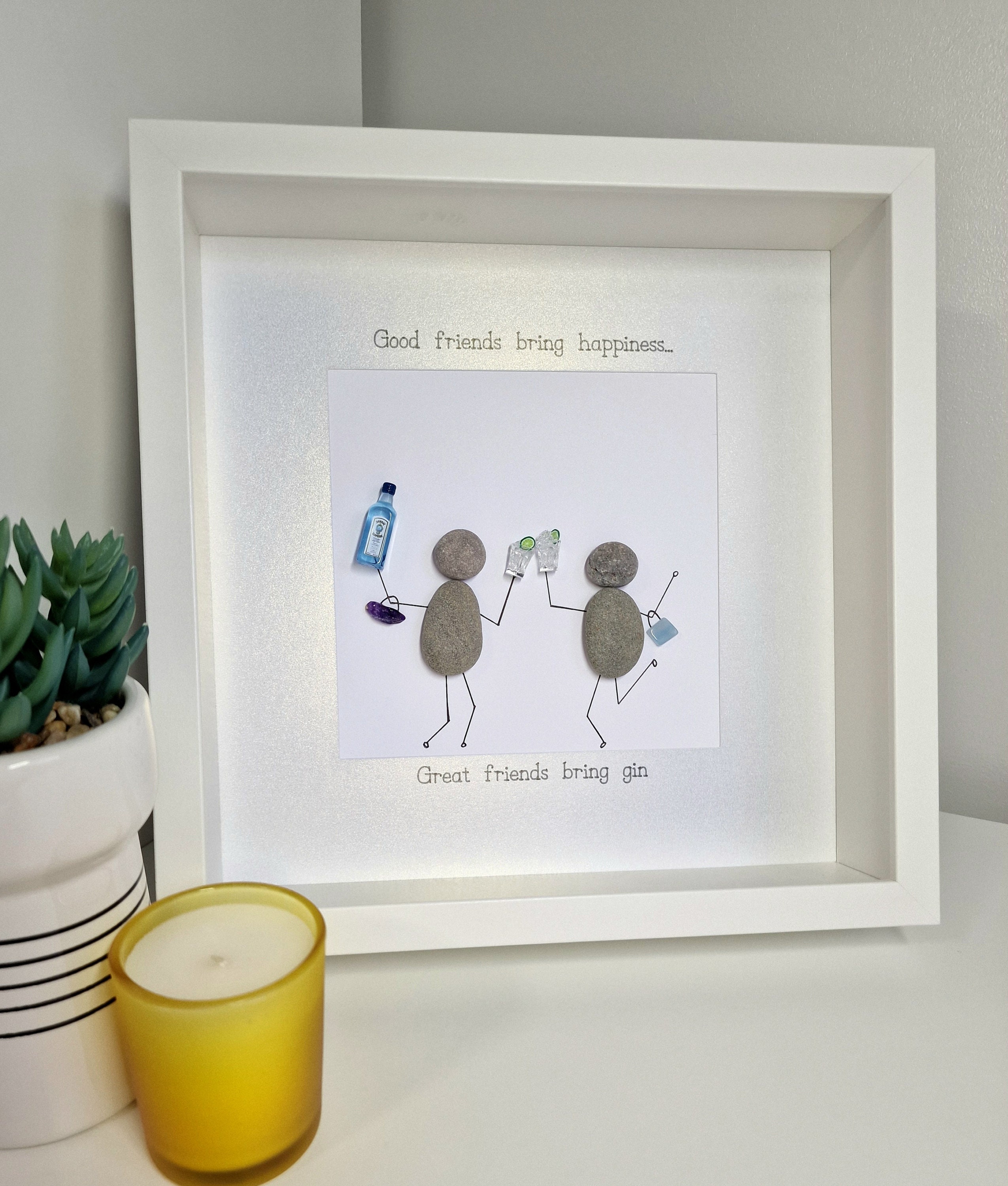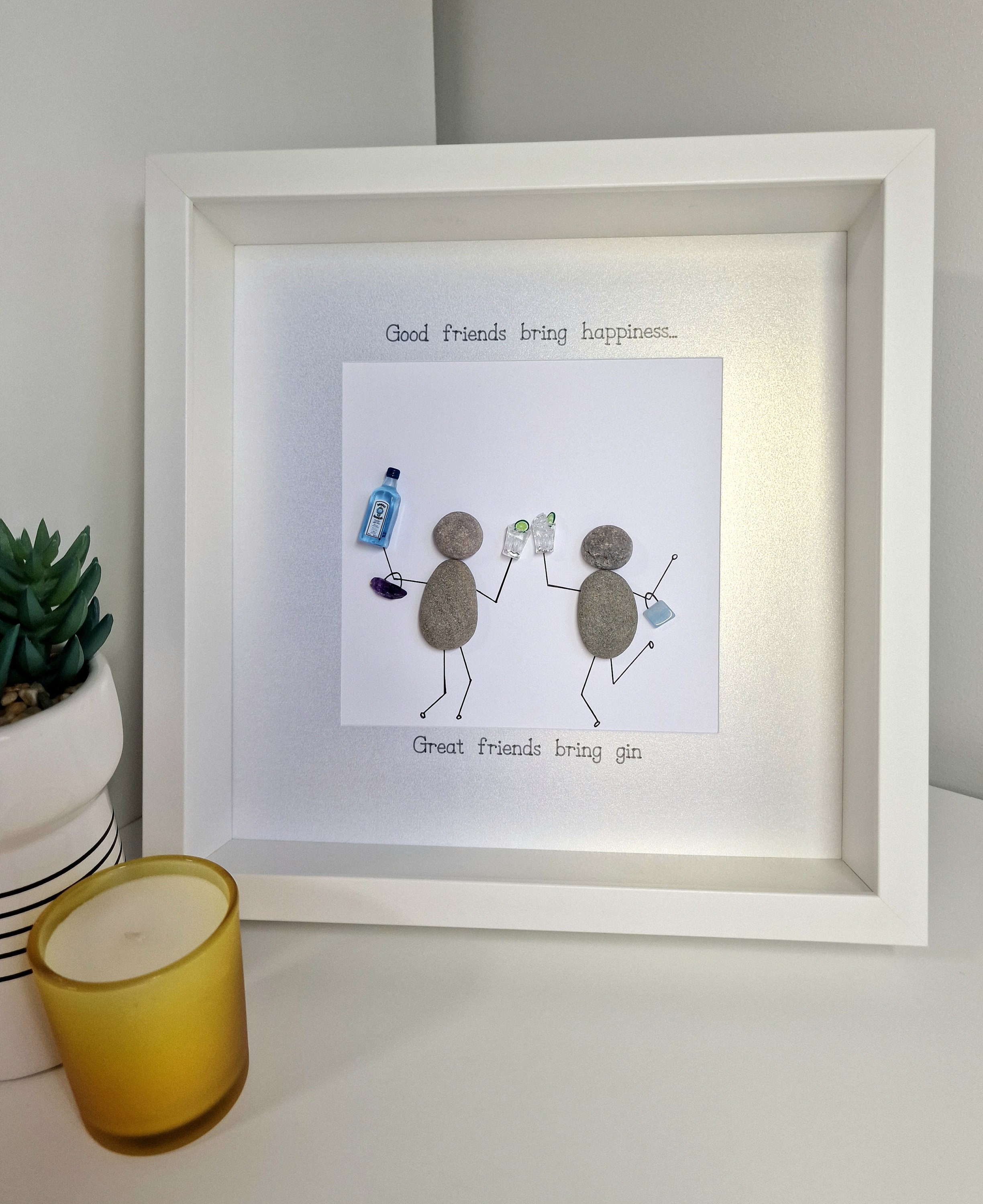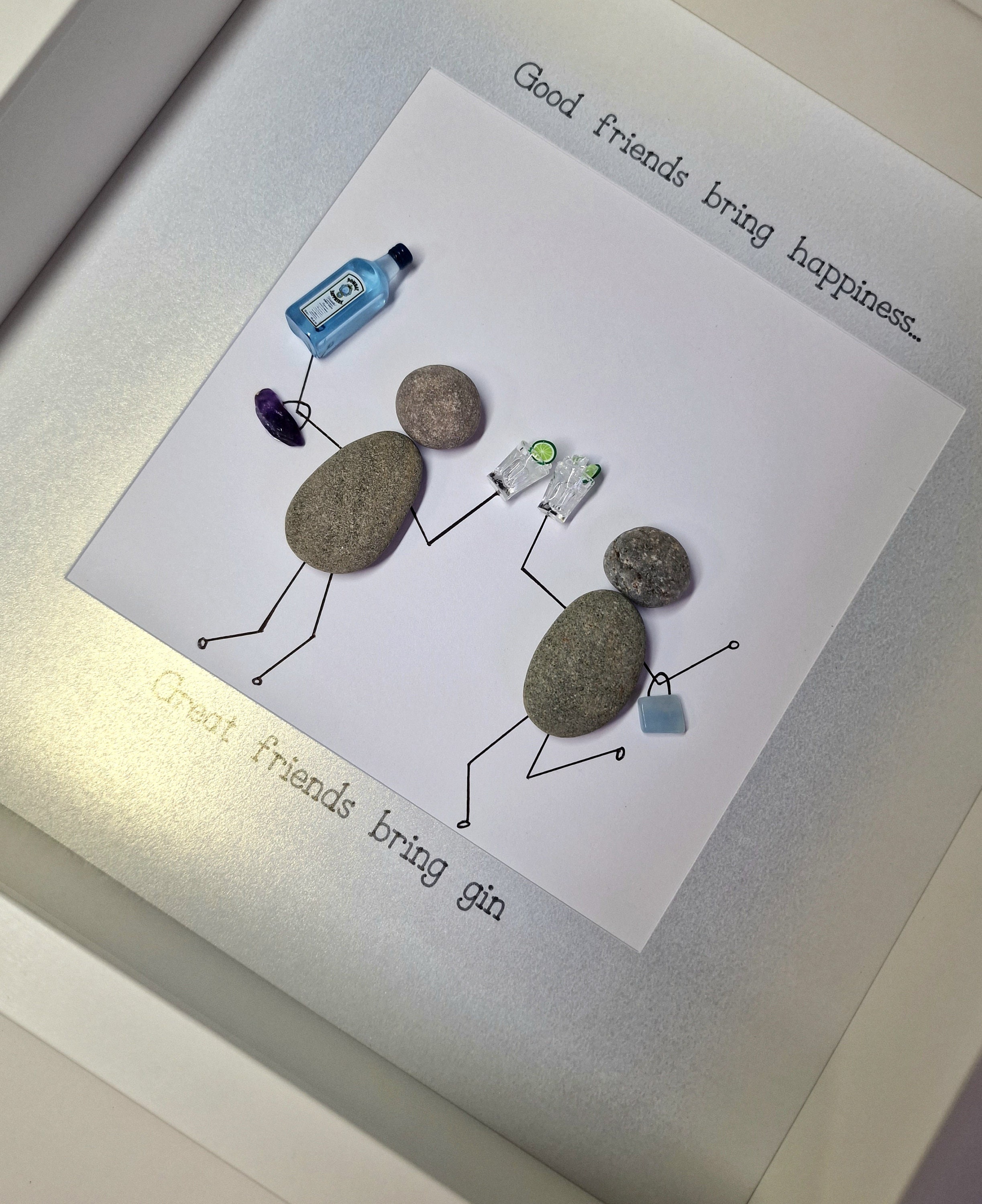 This listing is for a pebble art framed picture with two friends. One friend is holding a bottle of gin, and both friends are toasting with a glass filled with ice cubes and a slice of lime. Each friend has a handbag on their arm. The quote 'Good friends bring happiness...great friends bring gin' is written on the picture mount.