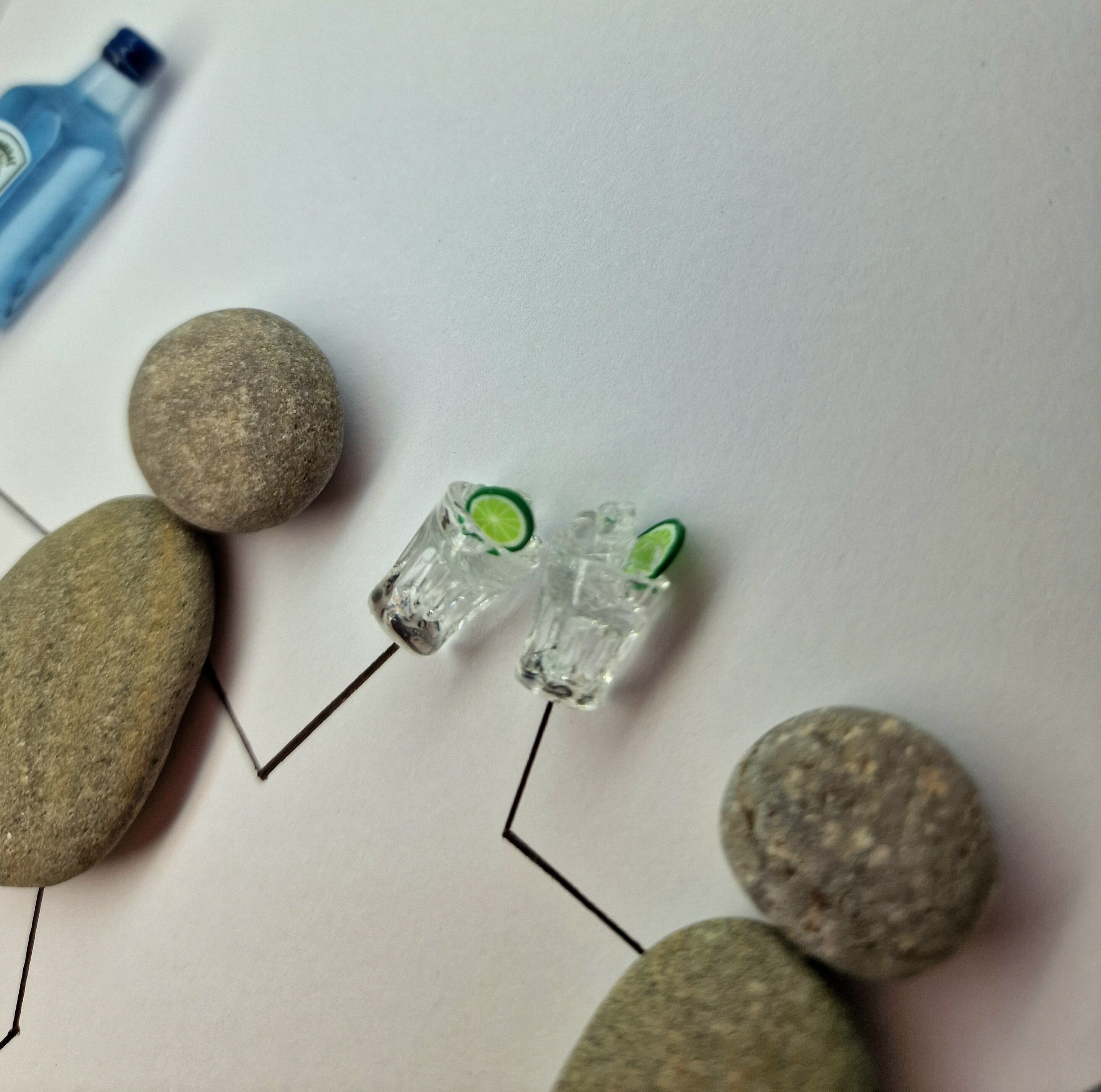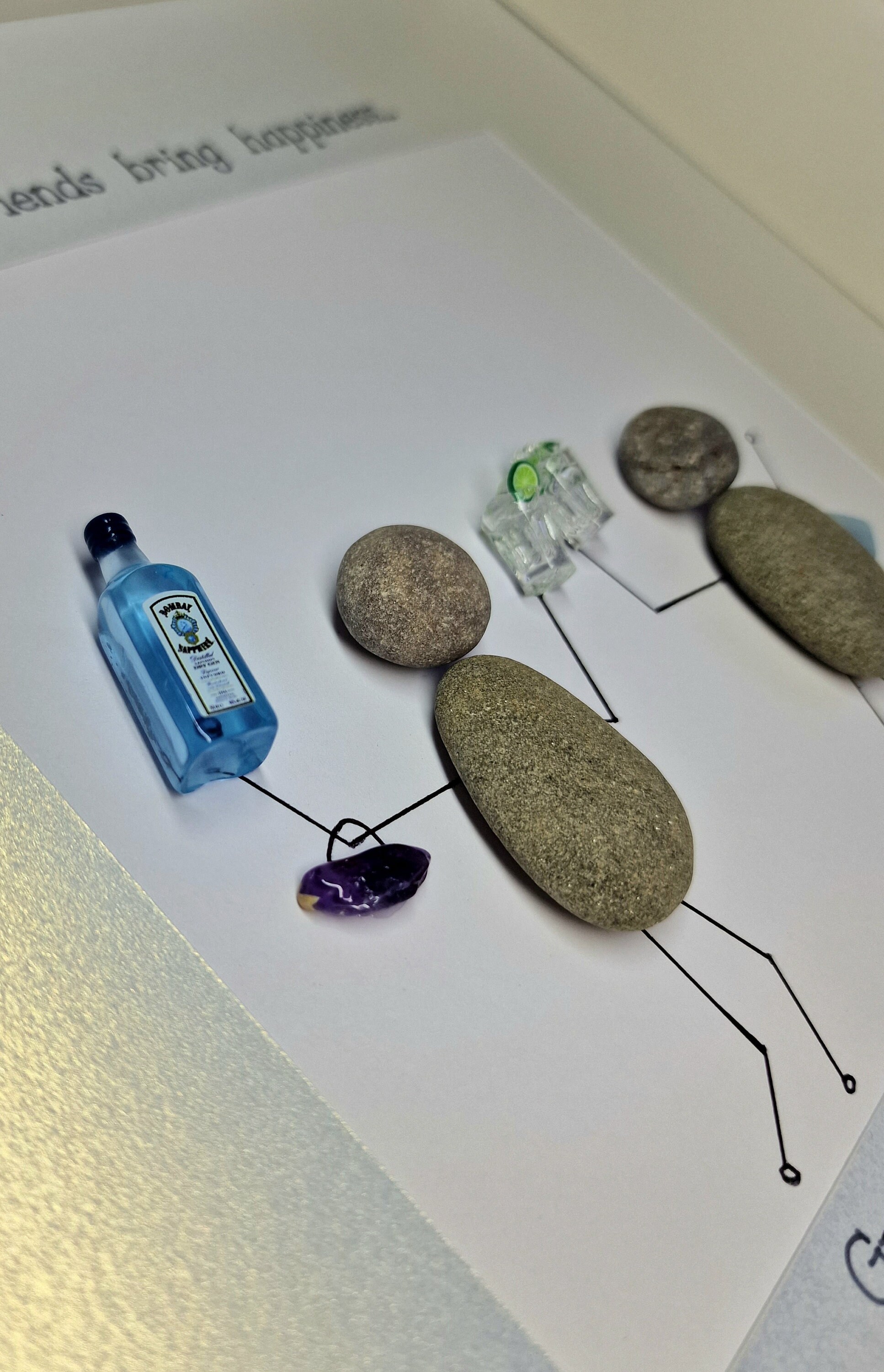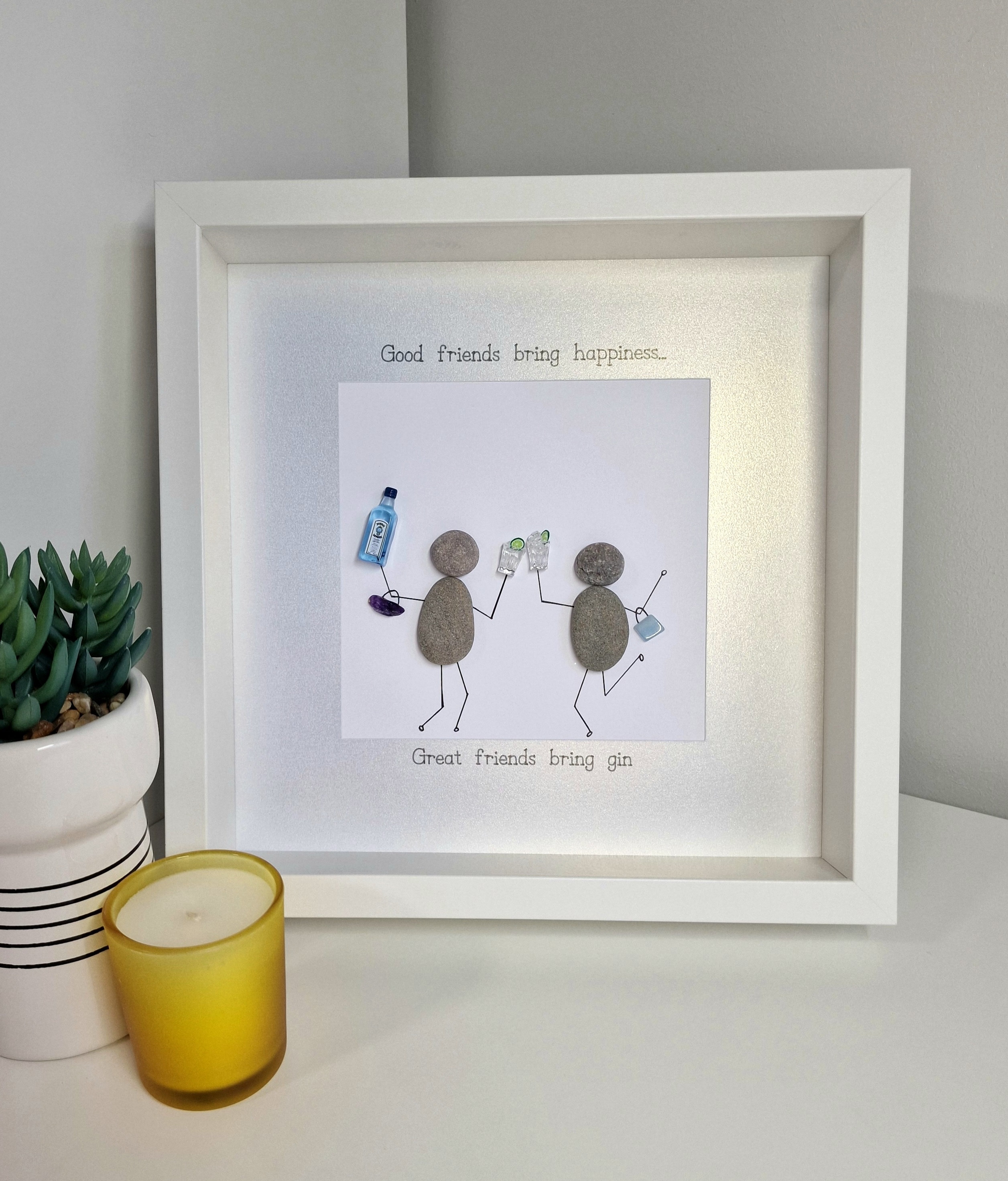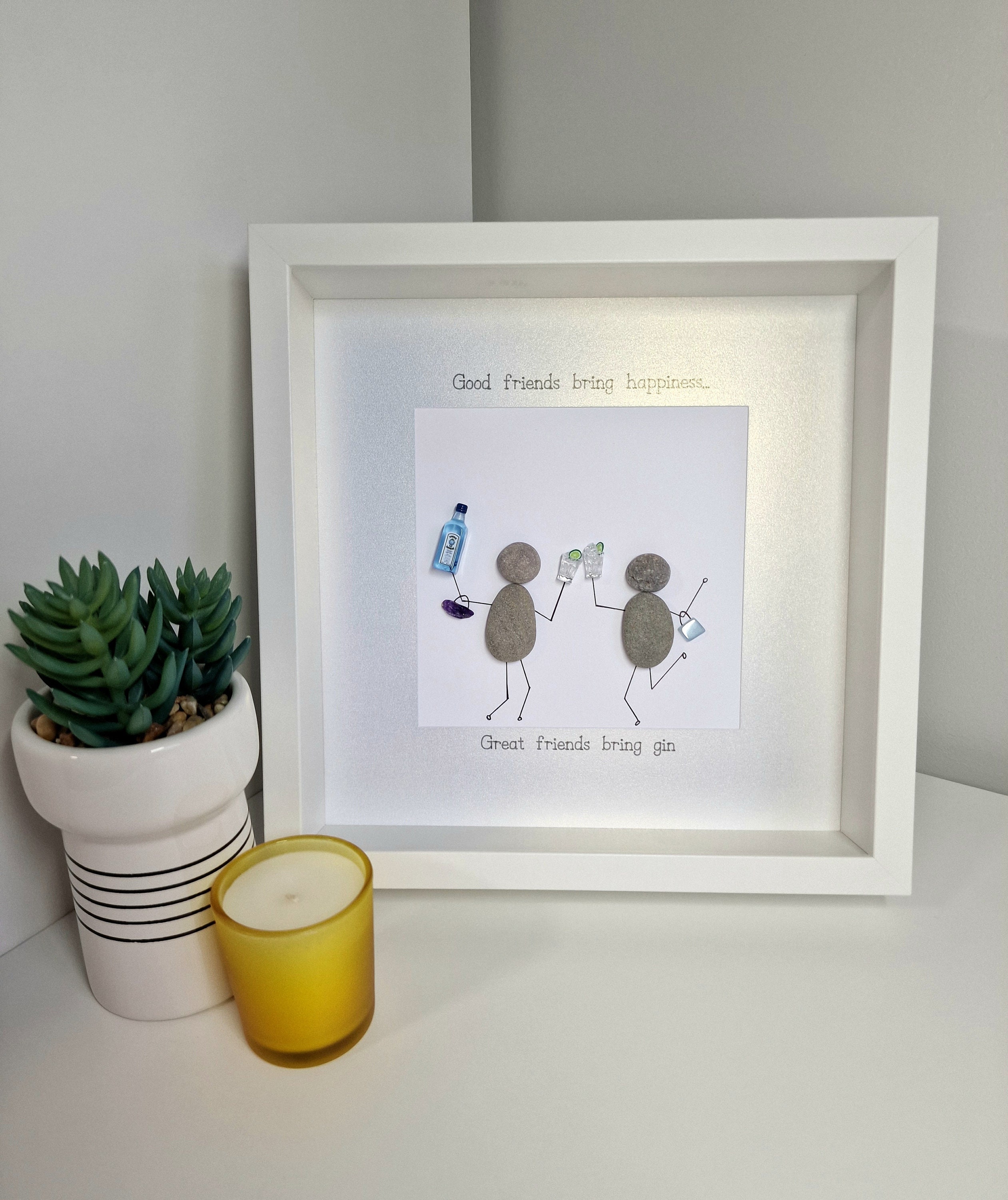 This listing is for a pebble art framed picture with two friends. One friend is holding a bottle of gin, and both friends are toasting with a glass filled with ice cubes and a slice of lime. Each friend has a handbag on their arm. The quote 'Good friends bring happiness...great friends bring gin' is written on the picture mount.