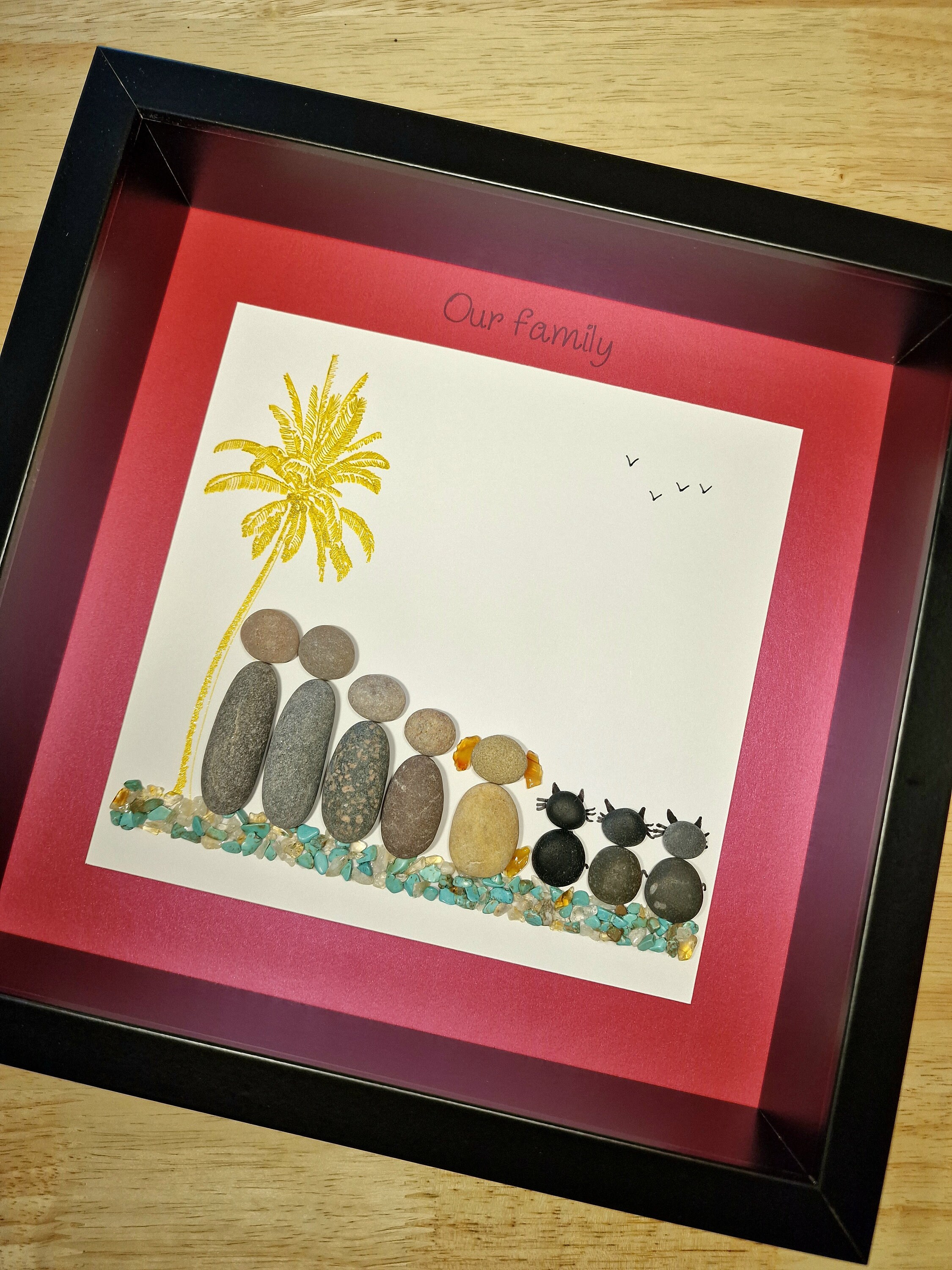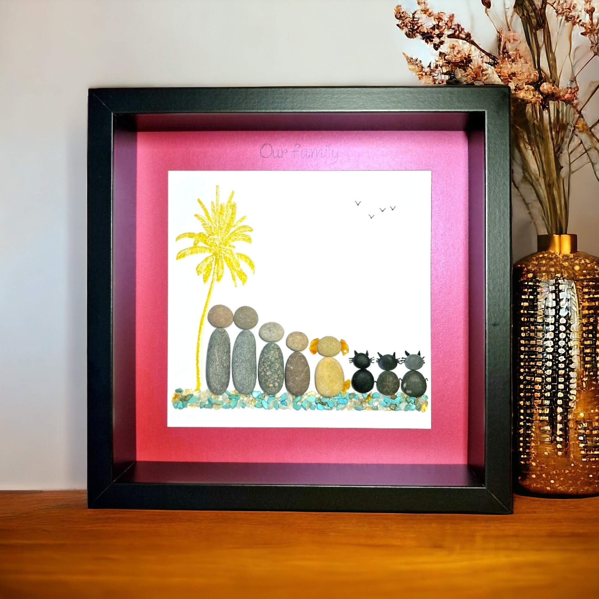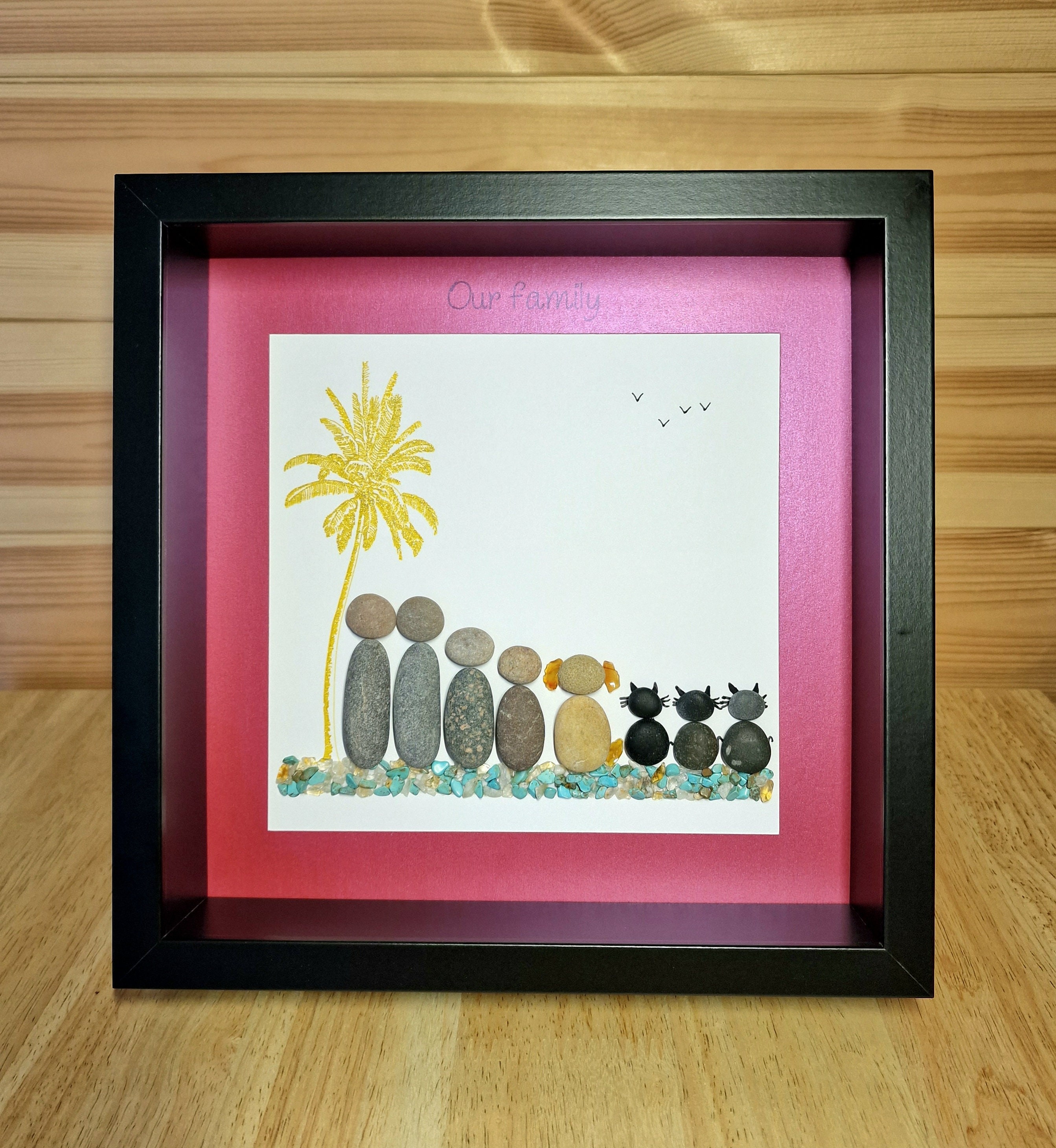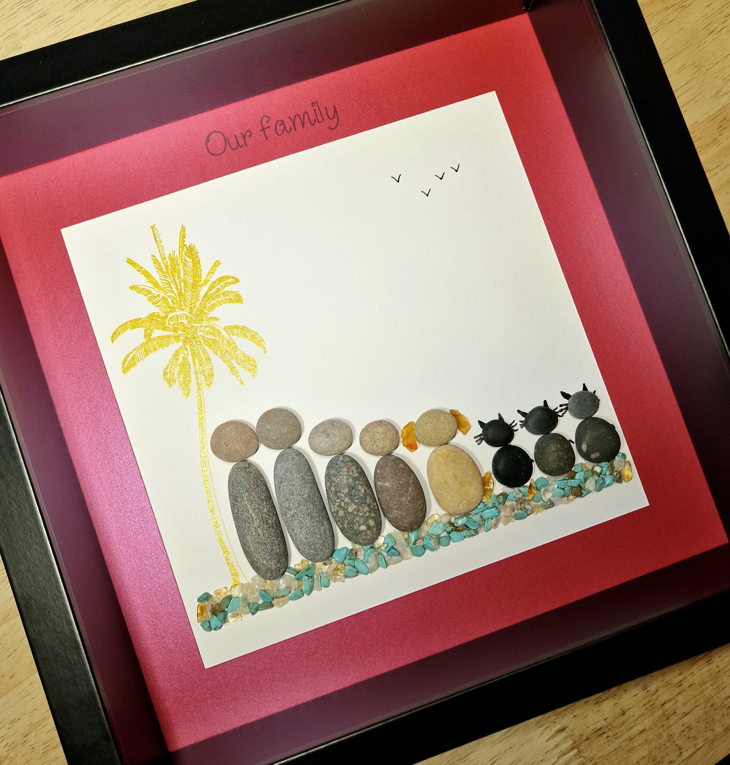 This listing is for a framed pebble art picture featuring a family of 4, their dog, and 3 cats. They are sitting on teal and gold coloured quartz crystal gemstones, beside a sparkly gold palm tree. The phrase ‘Our family’ is written at the top of the pink picture mount.