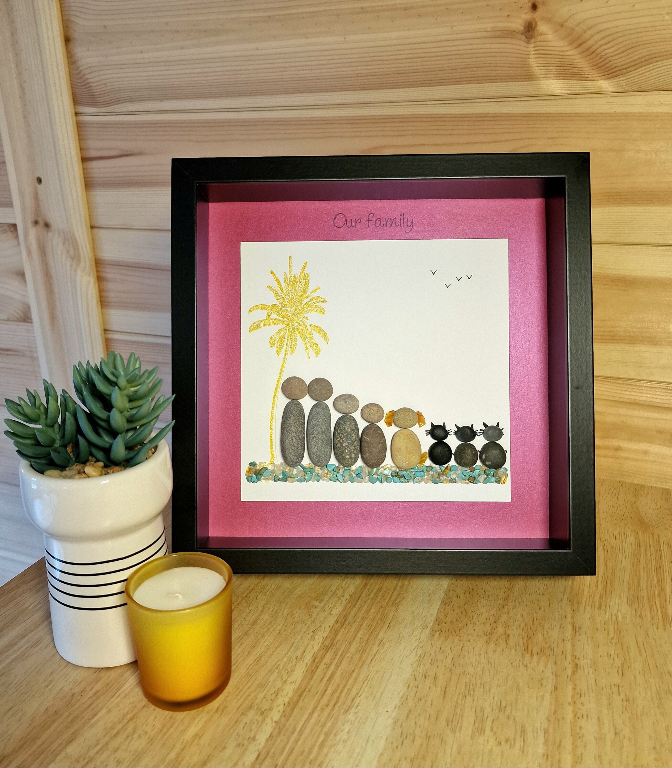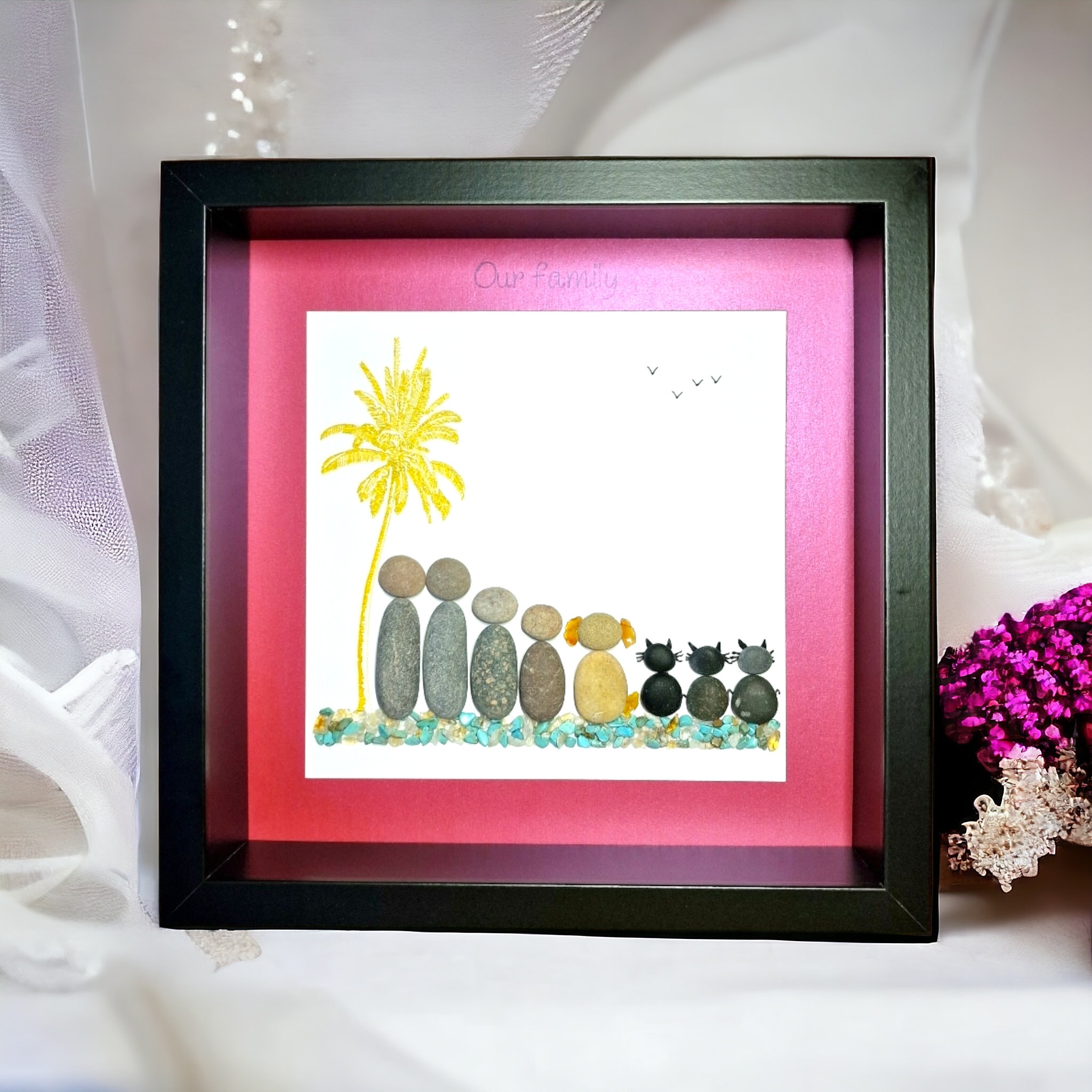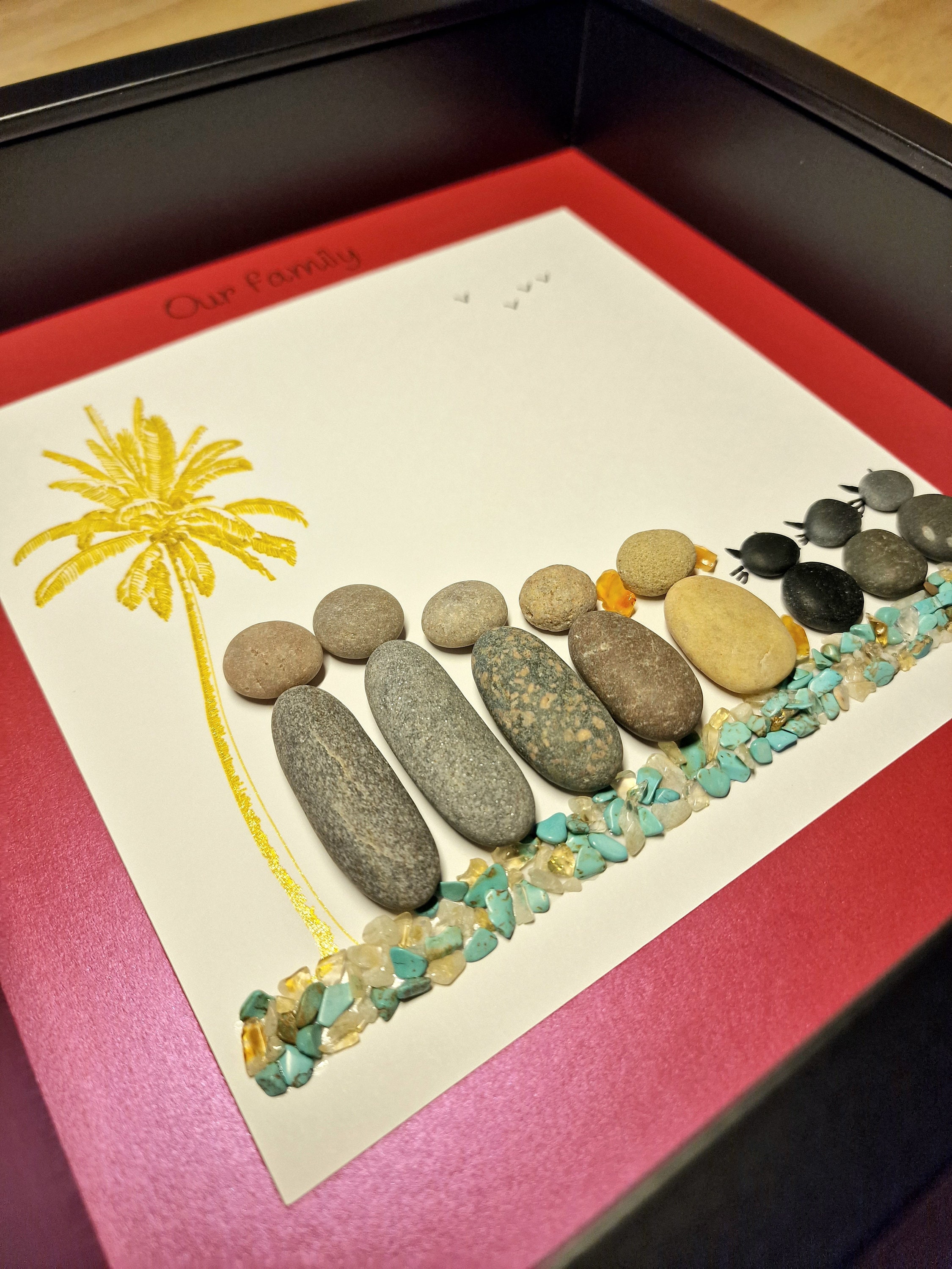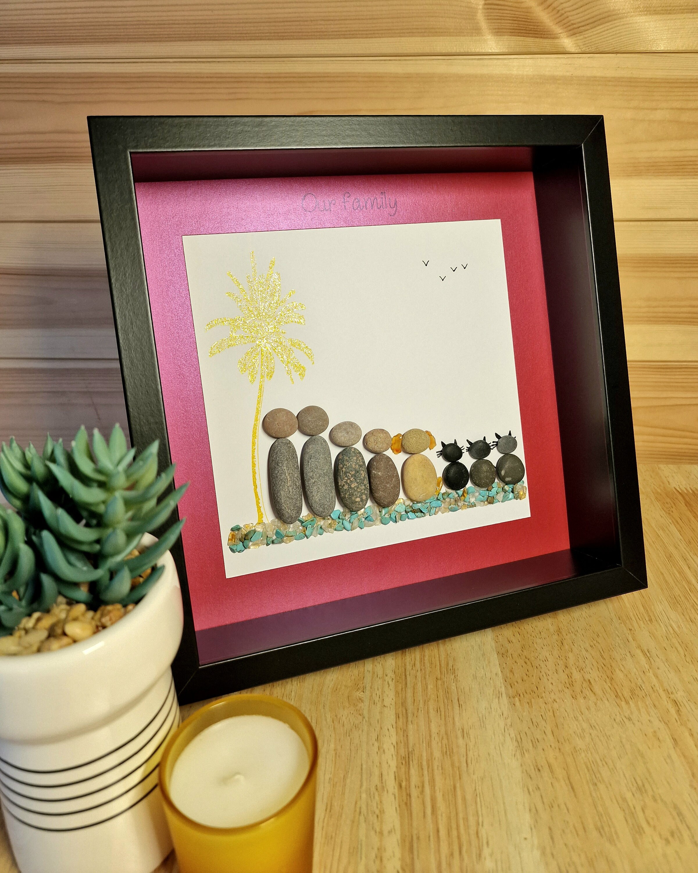 This listing is for a framed pebble art picture featuring a family of 4, their dog, and 3 cats. They are sitting on teal and gold coloured quartz crystal gemstones, beside a sparkly gold palm tree. The phrase ‘Our family’ is written at the top of the pink picture mount.